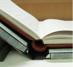 The adjustable space in the centre of the book support between the covered Plastazote® bases enables the safe positioning of the spine of the books placed on the support. Different book sewing structures open in different ways during use, for example: hollow back books need space to accommodate the spine which is detached from the text block. Positioning books properly on the support enables the pages to be turned more easily and the adjustable cradle enables the dimensions of the gap to be increased or decreased to accommodate books of different thicknesses safely.