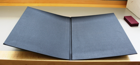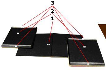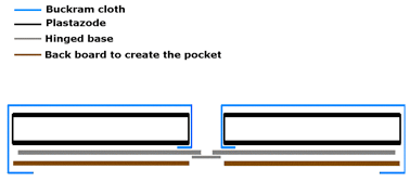 1. The base is formed by two 3mm identical boards. The boards are covered with buckram or any suitable archival material that join them together creating a central hinge of approximately 10mm.