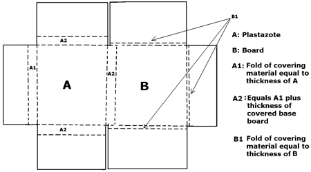 Next, secure the Plastazote® and the board bases to the cover material. Place the Plastazote® on A without gluing it but securing it with a weight. Glue the board on B aligning it with the Plastazote®.