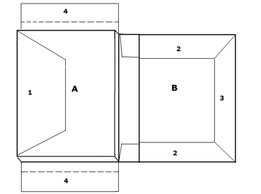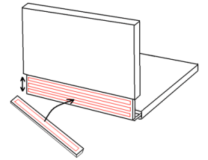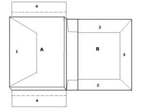 Close B onto A placing a compensatory thickness equal to the thickness of the covered base board (the base board itself can be easily used for this) to create the slit. Place the glue on 4 and fold it over the verso of B at both sides.