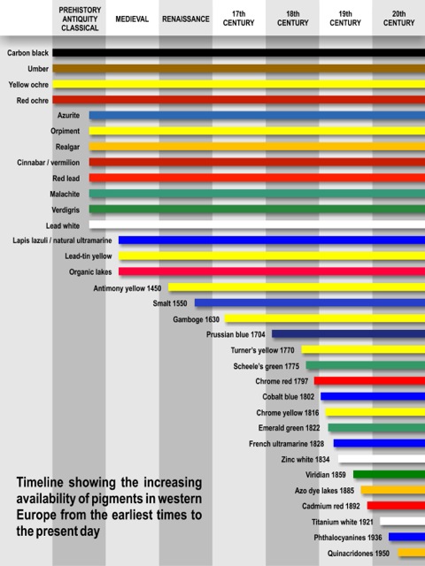 A timeline was used in the lecture to show that the medieval palette was largely mineral-based, for developments in chemistry and synthetic pigments were yet to come. While scribes kept their inks in inverted cattle horns, the illuminators’ paints were prepared in oyster or mussel shells. They used red, blue and green paints, while gold leaf was used for their most precious work. Colours were prepared as paint, a mixture of pigment, binder and a solvent, while gold leaf was applied to a layer containing red bole and egg-white glair as adhesive.