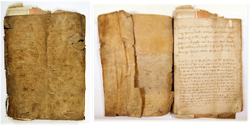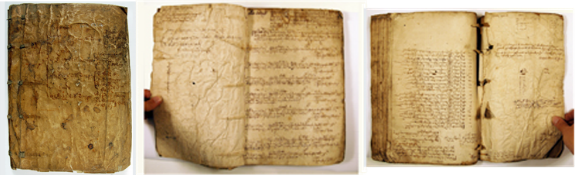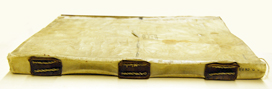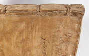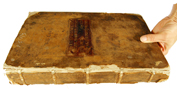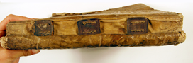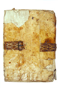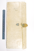 The foredge is often held closed by two sets of ties either of alum-tawed leather or cloth ribbon but sometimes there is a flap coming either from the back to the front or from the front to the back – this may just depend on which way the clerk opened it first – and may be closed by a buckle or tie.