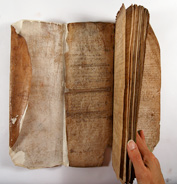 The same simplicity is also seen in volumes used for purposes other than the church. The Bedford Borough archives include a run of court books from the 15th century to 1798, which allows us to see a progression in the binding styles used. The first five volumes all show a very simple long-stitch construction in a limp parchment cover that is just roughly turned in. This one is number 6 and dates from 1512. It shows the first signs of sewing on slips.