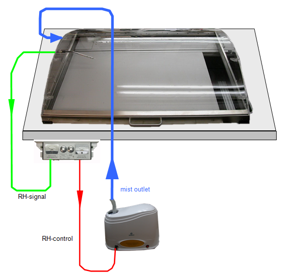 The humidification system he built is ‘self-controlled’, which means that the closer the actual humidity comes to the desired value, the less vapour will be blown in. A blue light on the HCU (Humidity Control Unit) lights up when vapour is blown in.