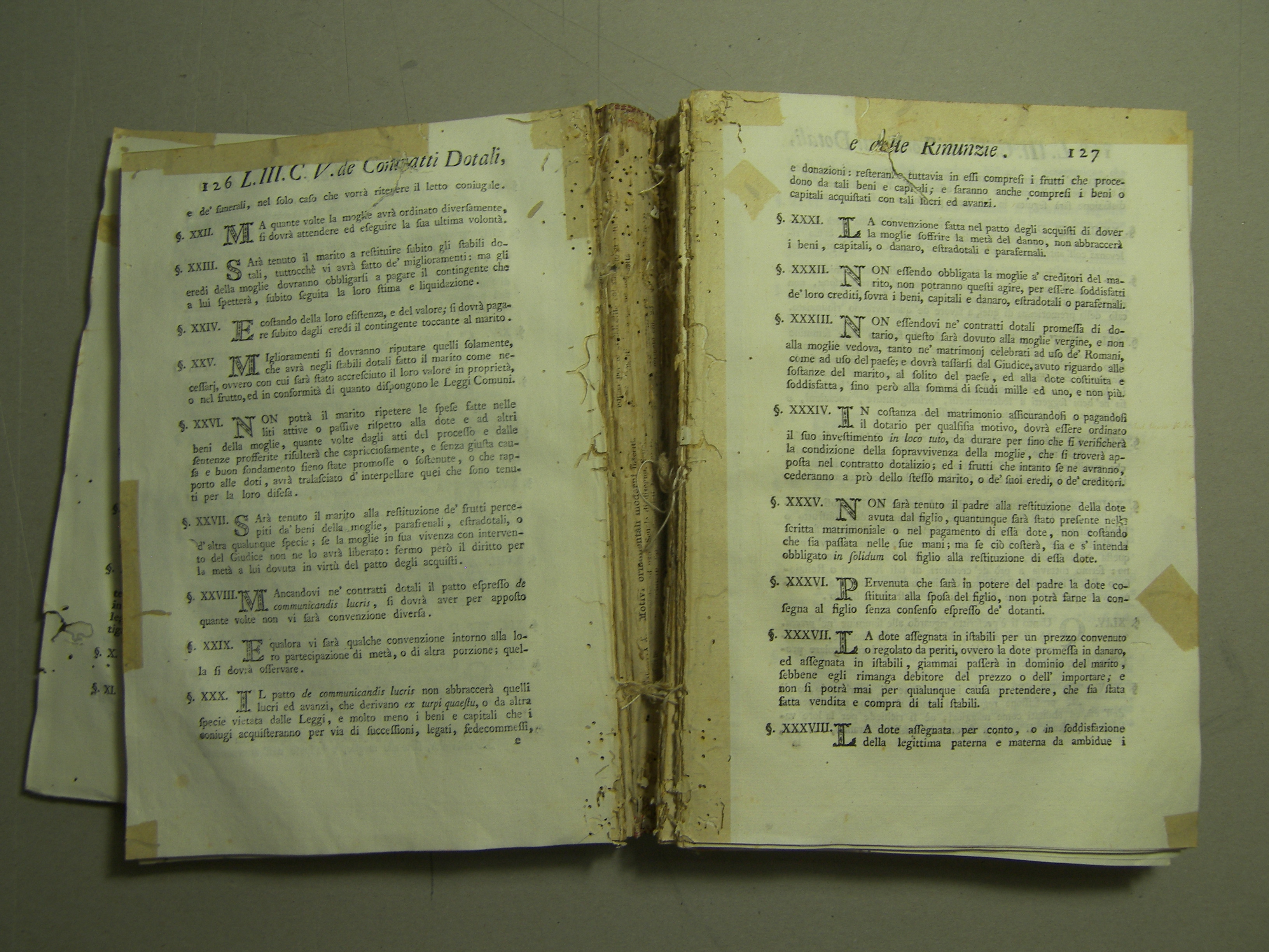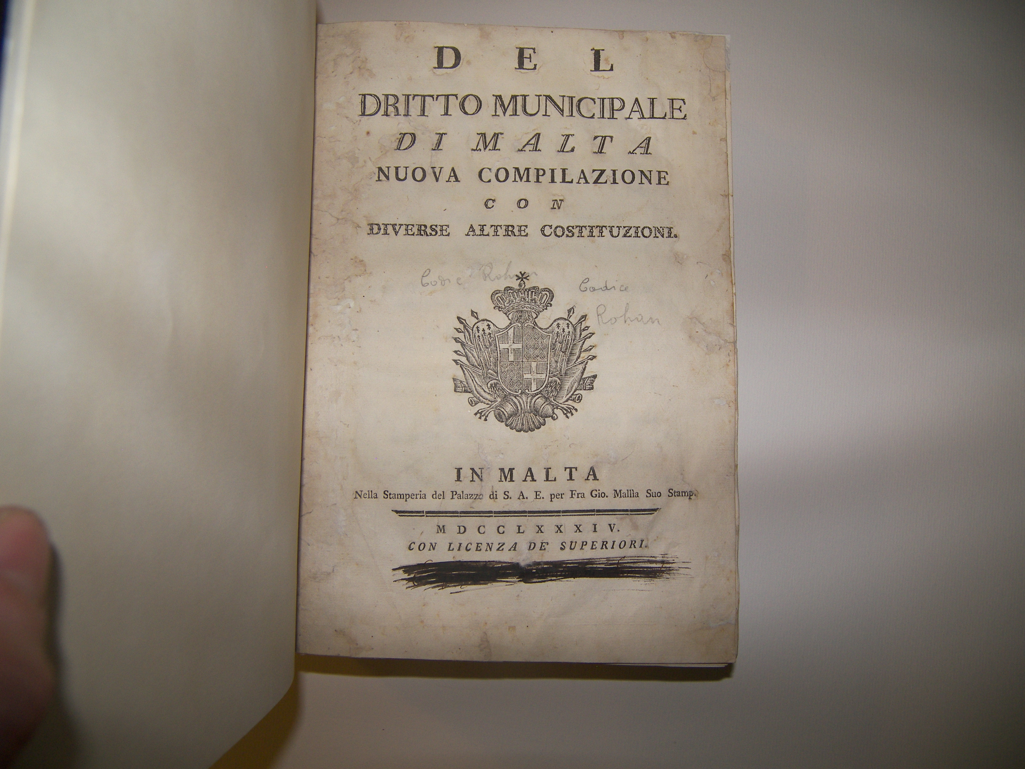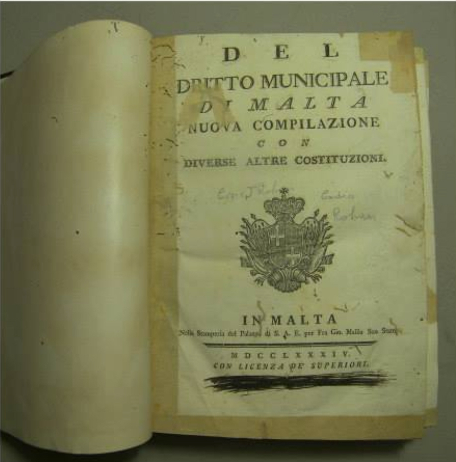 The Del Dritto Municipale di Malta (Malta, 1784), is often referred to as the ‘Codice de Rohan’. It was commissioned in 1776, by the then Grand Master Emanuel de Rohan Polduc, the last Grand Master of the ruling Order of St John. Part of de Rohan’s reforms included a thorough restructuring of the courts and a revision of the constitution. The Codice, or at least parts of it, was used well into the time of the British occupation of Malta, making it one of the most influential publications printed on the island (Thake, 2015). The National Constitutional Court of Malta is the owner of one copy of the book and commissioned its conservation.