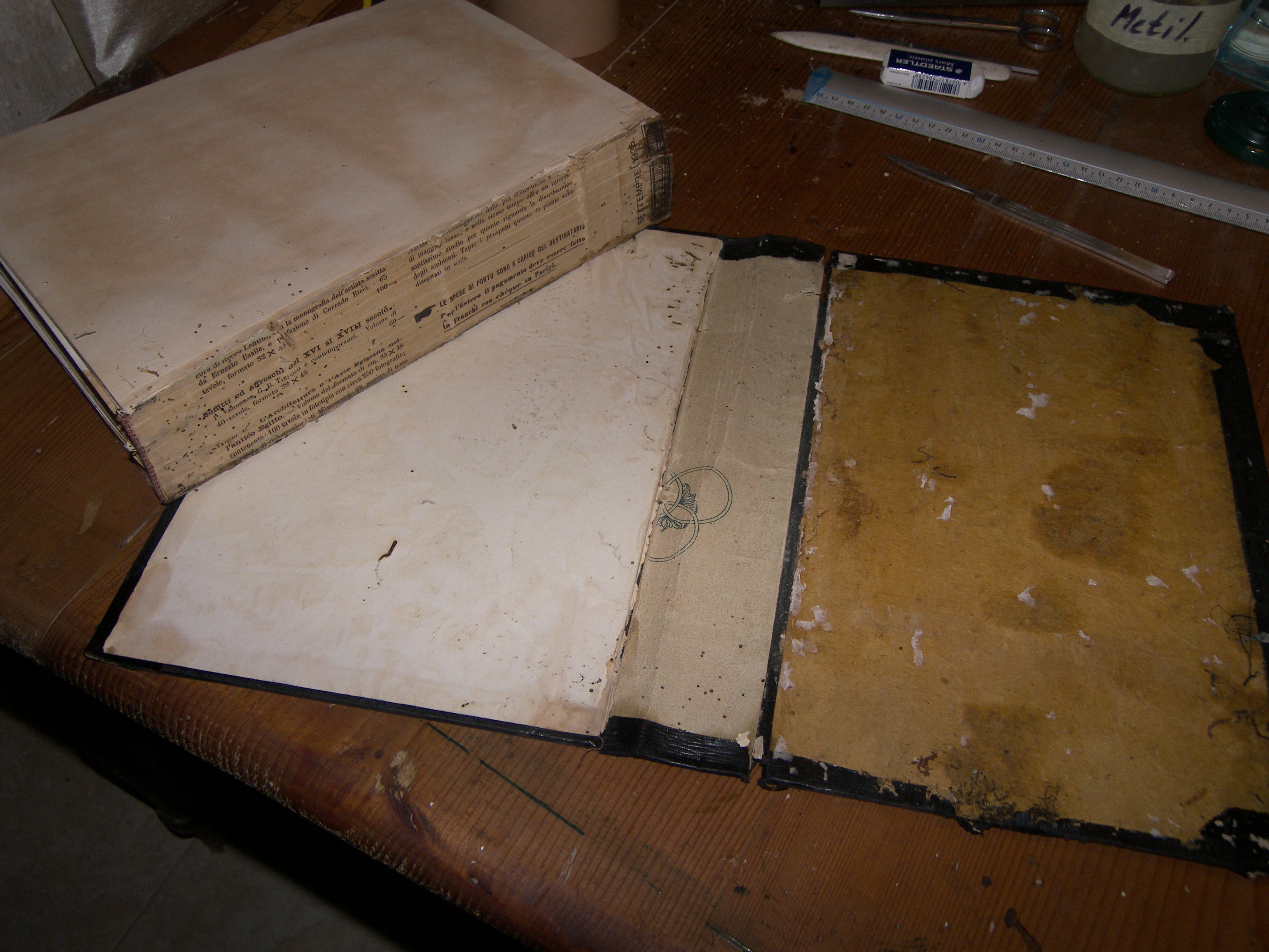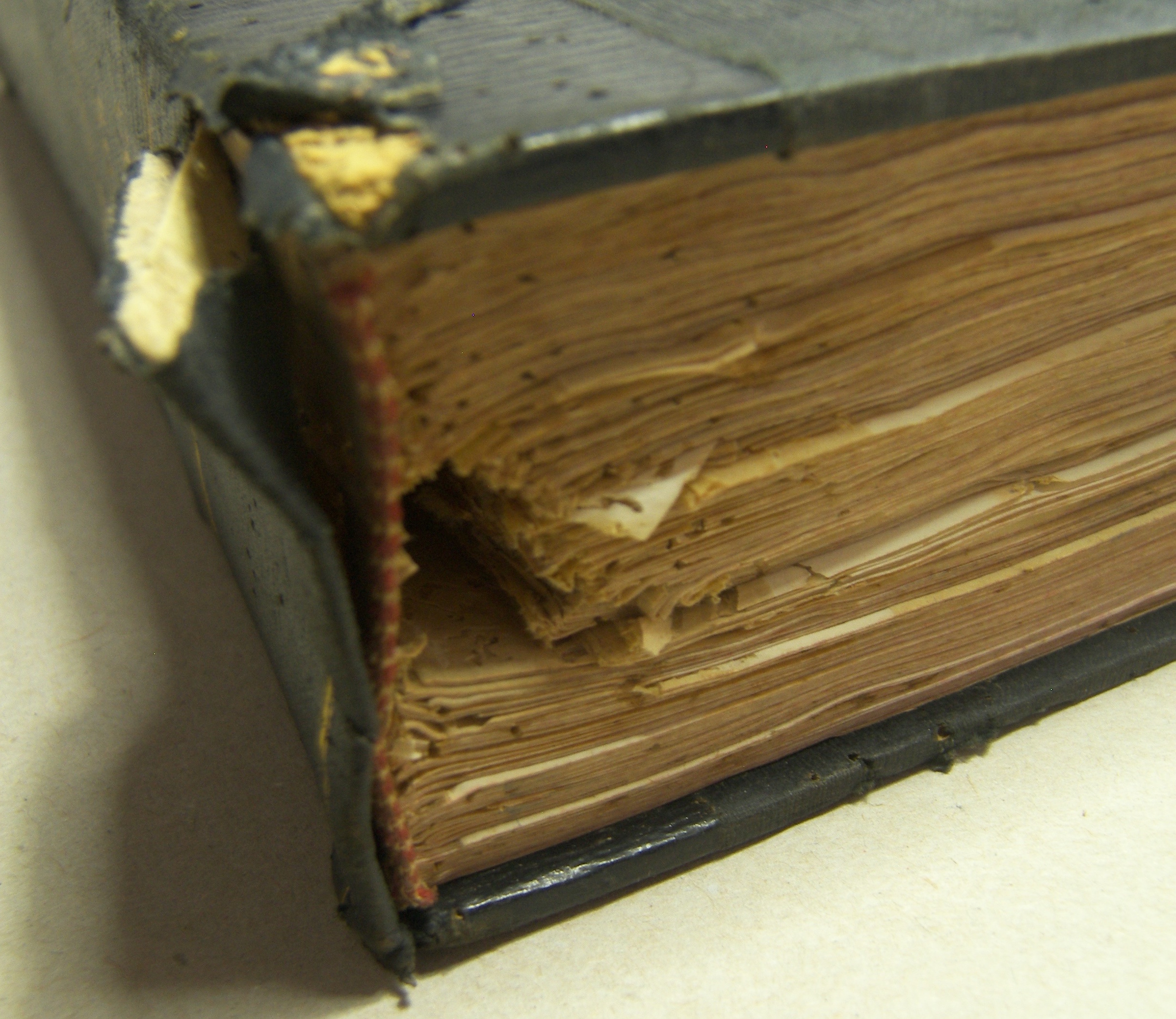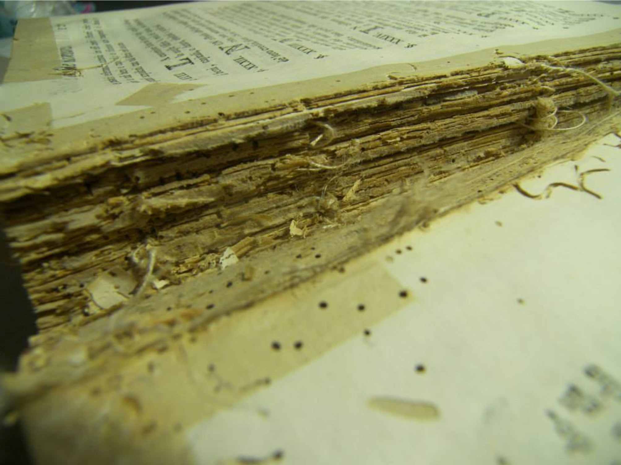 The book was clearly in bad condition, having been attacked by bookworms throughout the text block. Almost 85% of the pages had been damaged by holes, as had the boards and, more noticeably, the spine.