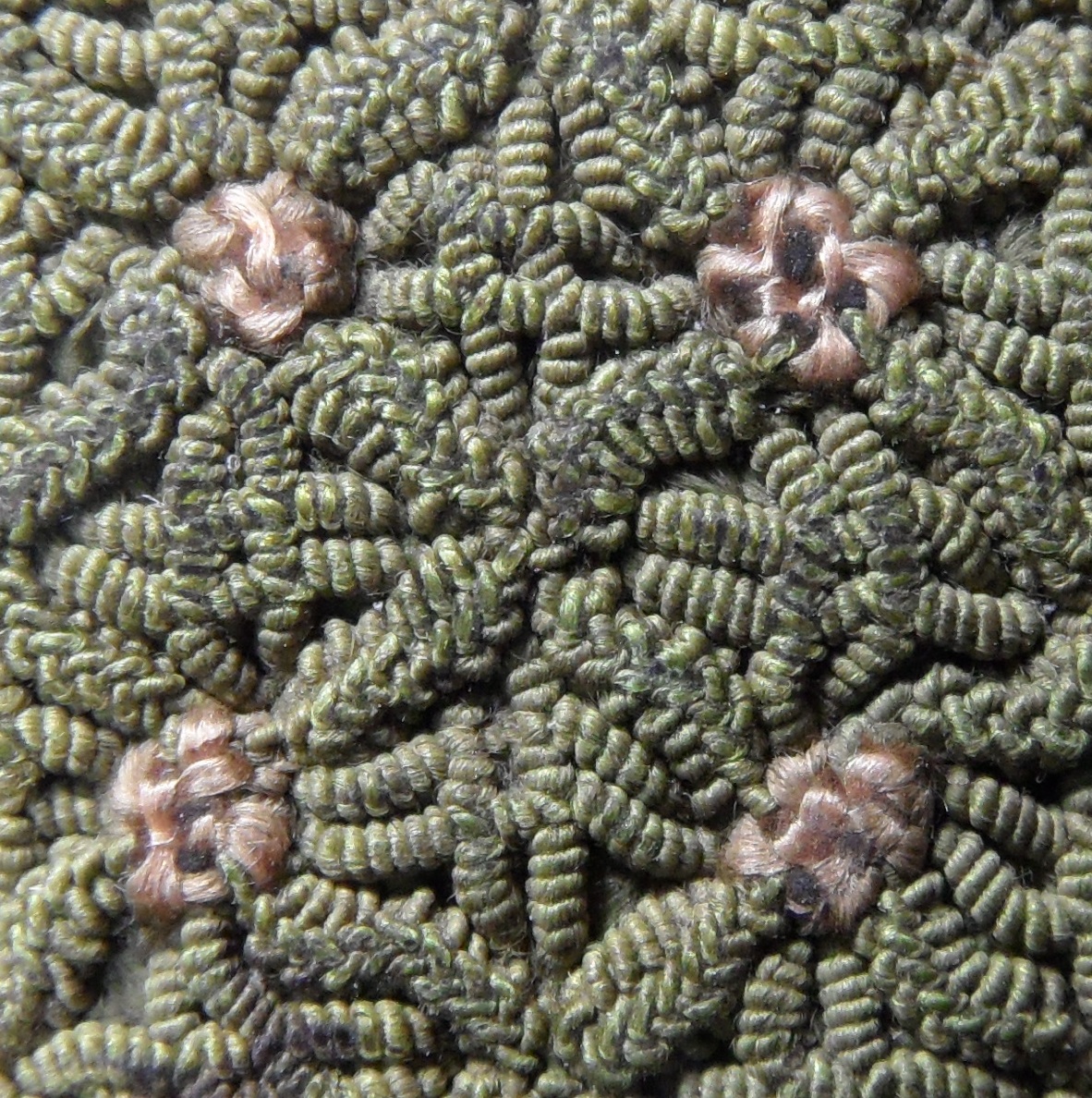 Whilst silk gimp is not a unique find, it is normally a large-scale decorative feature, couched down onto fabric with a separate sewing thread. I have never seen gimp used to make embroidery stitches as it has been for this cover, and so far no one with whom I’ve consulted is aware of any comparable work of this nature. I would love to hear otherwise, if anyone has suggestions.