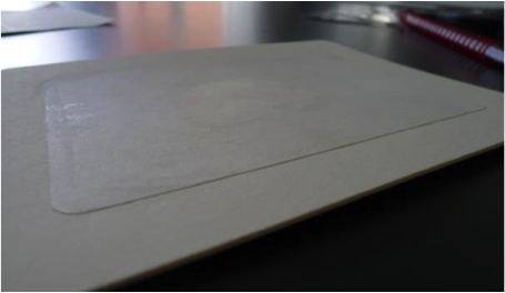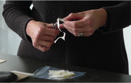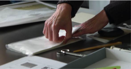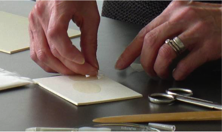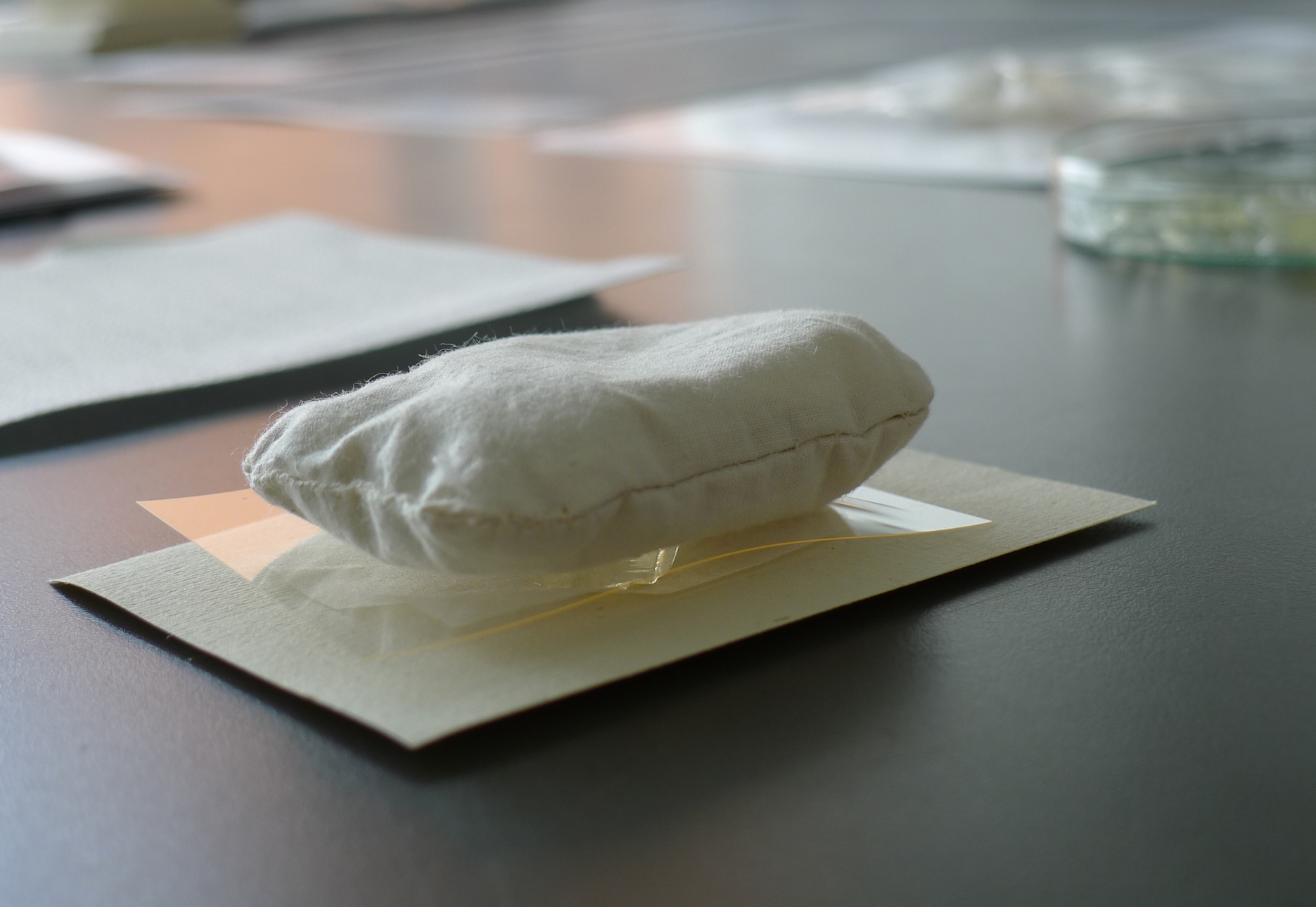 For a remoistenable preparation, two layers of 4% gelatine adhesive are recommended. When used in combination with gelatine mousse, the edge of the caecum piece can be pared with a scalpel on a piece of board (to minimize the risk of slipping), or by carefully sanding it with fine grain emery paper. The caecum is then humidified (for small/medium-sized repair pieces, Antoinette uses a sort of humidification ‘wallet’, as seen in the photograph below) before the adhesive is applied. Shaped pieces of polyester film can help as a carrier to precisely position the repair onto the required area of the membrane.