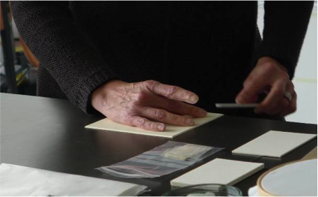 The pieces of dried isinglass mixed with an appropriate amount of de-ionized water are heated to 42oC to produce the adhesive solution. Antoinette led a complete preparation of isinglass pre-coated tissue, for which she uses a polyester film sheet lined with a matte laminate, whose texture is to be transferred to the coated paper, thus helping to reduce the above-mentioned sheen that frequently results from this type of preparation. The piece of paper is laid onto this base and the adhesive, in warm liquid state, is carefully and evenly brushed through with a sizing hake.
