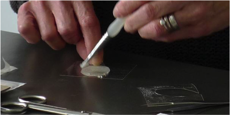 Poulticing: This less-common application of gelatine was the focus of Yuki’s presentation and subsequent demonstration. As revealed by tests undertaken at the NRO, a higher concentration (8-10%) is required here to avoid an excessive release of moisture. The bloom does not seem to be relevant to this aspect, but rather for the consistency of the gel; the lower the bloom, the softer the gel. The poultice is locally applied as a rigid gel, sandwiched between pieces of spider tissue (underneath, in contact with the object) and polyester film (on top), under light weight, for approximately 15 minutes. A Petri dish is a handy container for limited quantities of this preparation, with discs of siliconized paper at the bottom with a little tab for easy removal, and spider tissue on top of the solution. The transparency of the glass allows a precise cutting of shaped pieces of gelatine for local application.