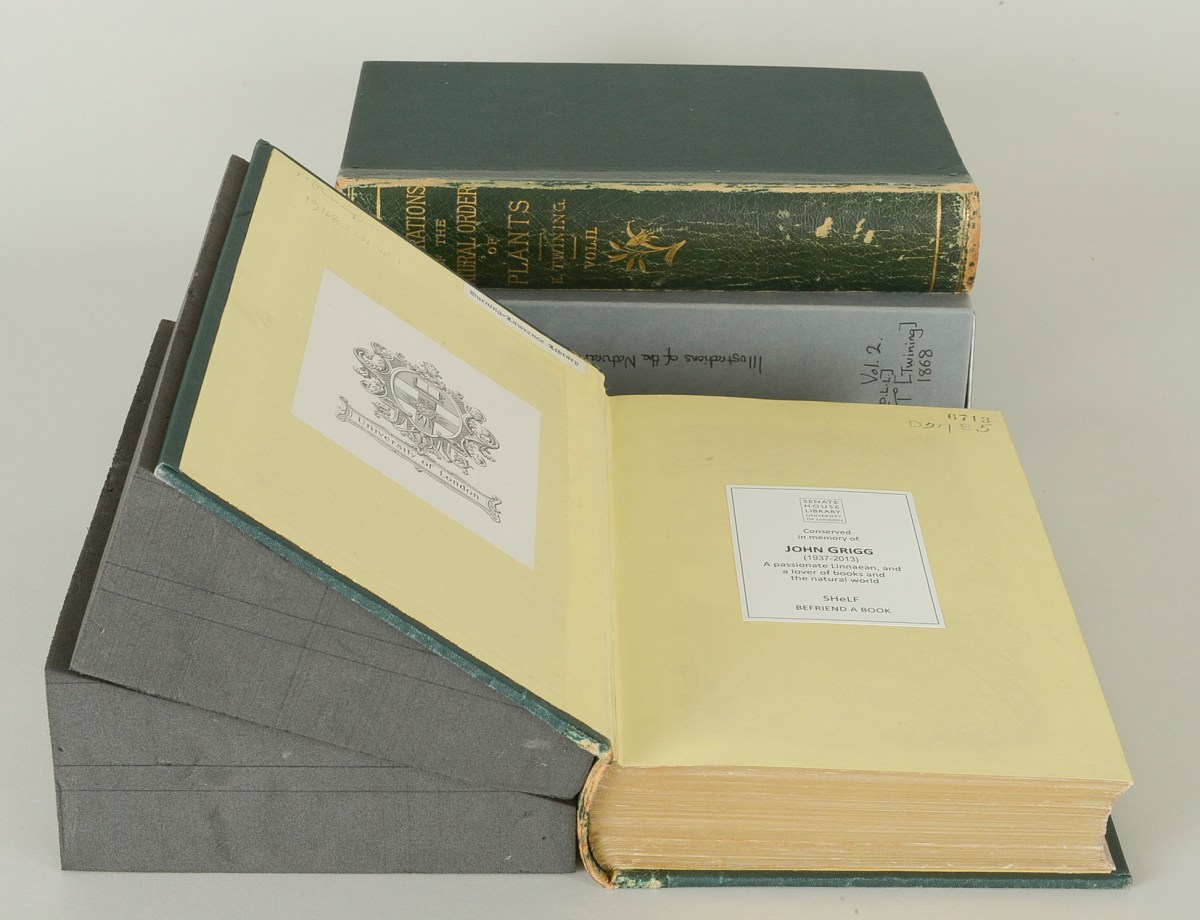 _CPH3259 Published Sunday 31st January, 2016 at 1946 × 1493 in Conservation of a caoutchouc botany book ← Previous Next → The two volumes after conservation showing the repaired endleaf joint and the bookplate commemorating John Grigg, in whose memory the book was conserved through Senate House Library Friends’ BeFriend a Book scheme.