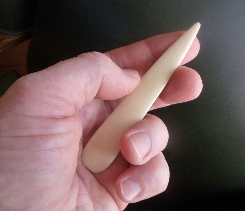 Having six fingers on one hand may sound uncomfortable, but if one of them is a small, smooth bone-folder, like my favourite tool, you’re in good shape. This slender ‘digit’ was given to me by Danillo Cooper, a mate on the bookbinding course at the London College of Printing, in 1987/88. He had reduced it to this size – 100mm long by 18mm wide at its broadest point – and shaped it before presenting it to me. At first I wasn’t sure how much use it would be. However, I came to rely on it more and more. It became an extra finger, though much finer, more delicate, smoother, more controllable. It helps me to turn pages of fragile manuscripts, to lift or move small pieces of paper or textile, to go over tiny pasted surfaces to ensure adhesion, etc. The only drawback is its size: it’s so small that it is easily mislaid. Once I thought I had lost it forever, and I really grieved over it. Months later, at the end of an exhibition, it came to light in a display case. I’d used it during installation and set it down behind a book, where it wasn’t seen. I think every book or paper conservator would like this tool, and I’ve always been grateful to Danillo for making it for me.