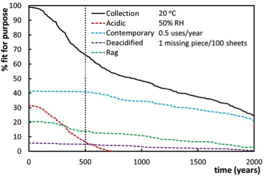 We also modelled the demographic curves for a research collection of historic papers (SurveNIR collection), exploring the loss of fitness for use with time. The collection as a whole will degrade in two waves, the first wave (~30% of the collection) represents acidic papers, while the second wave will largely be able to survive 500 years at room conditions. The model also enables us to evaluate the effects of cold storage or of deacidification (a typical interventive conservation treatment).