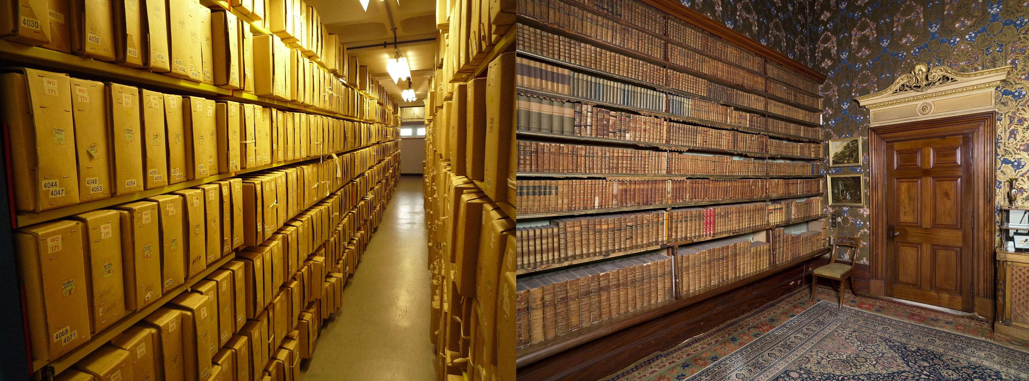 Left: The National Archives (UK) store and right: the historic library at Brodsworth Hall (English Heritage) – two very different collections in terms of collection use and environmental considerations.