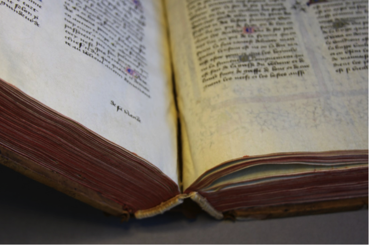 Fitzwilliam Museum MS 251 after conservation and rebinding, showing the opening arch characteristic of medieval binding structures. © Fitzwilliam Museum, Cambridge