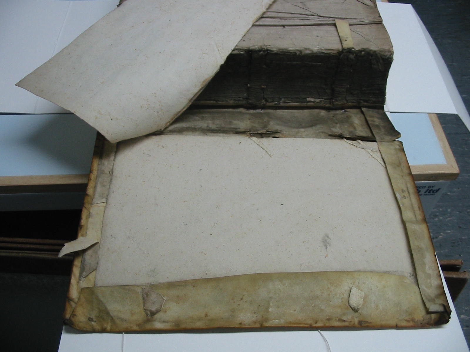Fig. 5 DL/C/222, LMA, London – opening left cover showing turn-ins, foredge ties and damage along textblock edges