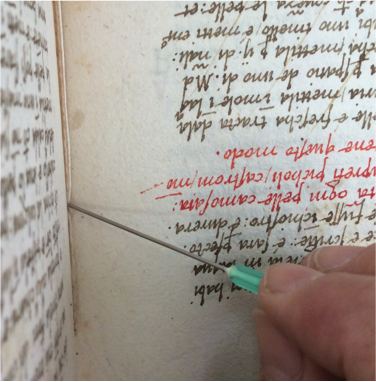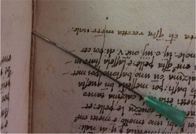 When consolidating the sewing structure of a book, very often the access to the sections’ back folds is not ideal: sometimes the shoulder has a sharp angle, maybe the inner joint is not open enough resulting in limited access. It can be quite time consuming, challenging and sometimes almost impossible to insert your needle from the outside of a selected section through to the middle of it successfully and without causing further damage. However in most cases the opposite journey is much more feasible. For this precise reason, the hypodermic needle can help!