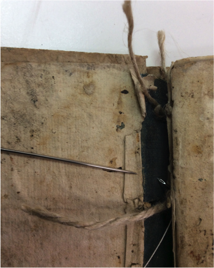 MANY thanks Lara for sharing your tool-trick. I would like to present an alternative which Christopher Harvey (College of Arms) let me know: a dental floss threader (http://www.gumbrand.com/between-teeth-cleaning/floss-threaders/gum-eez-thru-floss-threaders-840a.html) It works as the sewing needle itself. Needless to describe the advantages of its flexibility, but I find its most remarkable feature to be the strength and resilience the loop shows when (gently…) pulling the thread into and out of the sections.