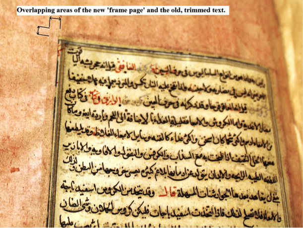 The previous sewing was, as expected with Islamic-style bindings, unsupported and done through two sewing stations only, as shown in the previous image, where the arrows indicate the marks left by the thread of the previous sewing.