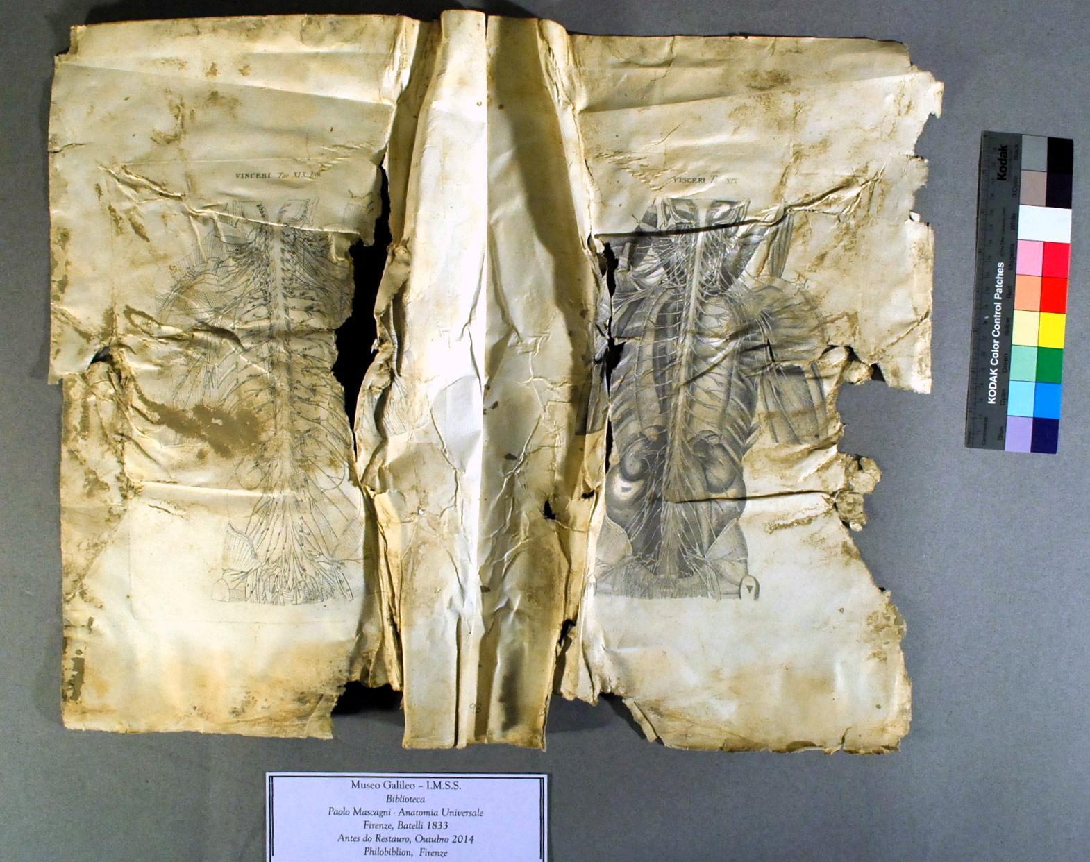 The Florentine Institute and Museum of the History of Science, now the Galileo Museum, had their hand-coloured copy of the little anatomy on display on the ground floor when, in the early hours of 4th November 1966, the Arno River flood hit the city. As is well known, books were salvaged and processed in a variety of ways at the time. Museums, libraries and archives were forced to make difficult choices about which items could be saved, concentrating the available resources on them. The little anatomy, big and heavy, was taken out of the mud, interleaved with filter paper and covered with sawdust to reduce humidity, but was then left untouched because it was considered irretrievably lost. It was placed in a cardboard box and put into storage.
