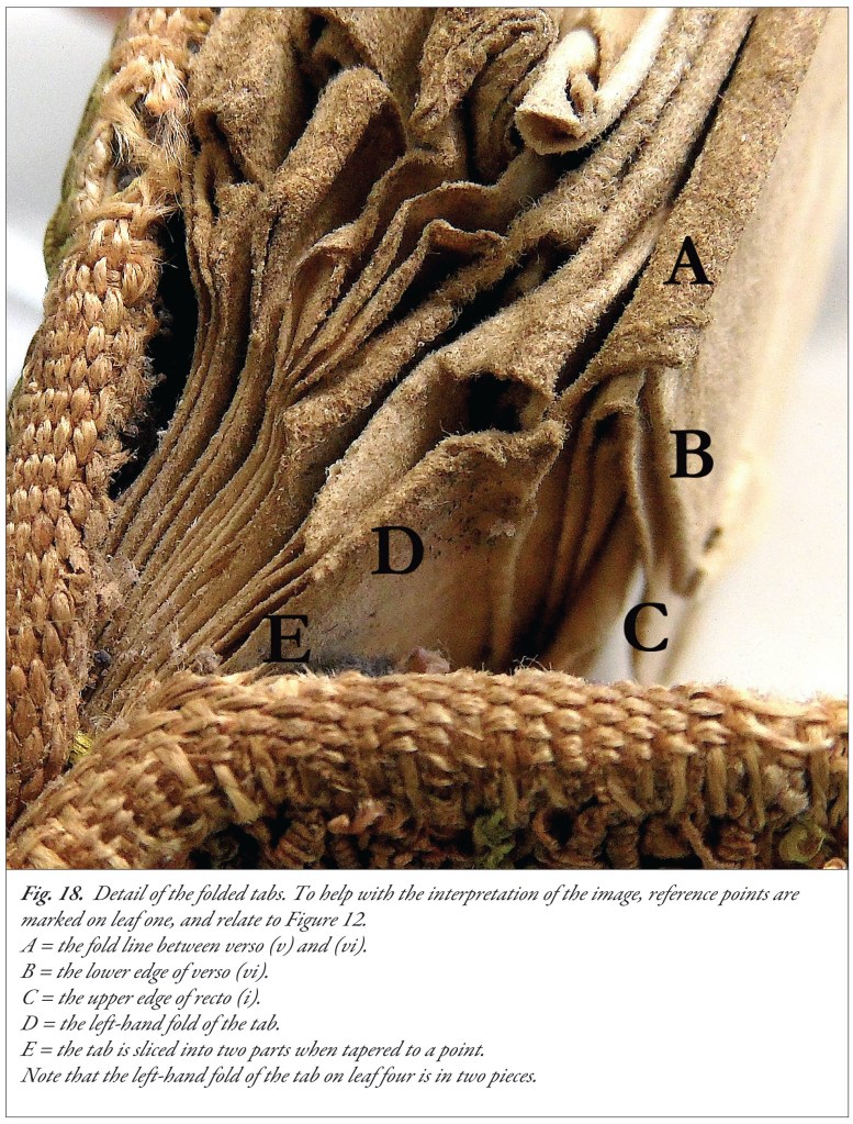 Furthermore, an expectation of finding a folded tab can alter one’s recognition of the evidence, and this may increase the detection of more examples as the folds of a tab begin to be differentiated from broken leaves and separate additions. British Library’s Sloane 807 is a case in point. Described by Gumbert as “small pieces of parchment sewn on the stub, of doubtful authenticity” (2016:166), the evidence has been reassessed as folded tabs. However, these folds differ from the format seen on MS.8932. Here, the tabs extend beyond the page to a depth of around 33 mm but are only the width of a single compartment. Nonetheless, each leaf has a folded tab with the parchment creased along two lines. The two base corners of the tab are folded inwards along diagonal lines until they meet in the centre, thus creating an elegant tapered point whilst padding out the stub of the manuscript (images online http://www.bl.uk/manuscripts/Viewer.aspx?ref=sloane_ms_807_f001r). The pinholes along the edges of the tapered point are comparable with evidence found on MS.8932. This suggests that Sloane 807 originally had a binding secured around the fold lines with overcasting stitches and a tubular edging, but that is another story. In the meantime, it will be interesting to see how an appreciation of folded tabs brings more information to light.