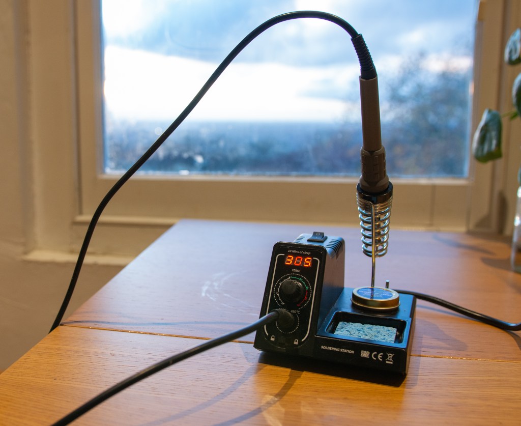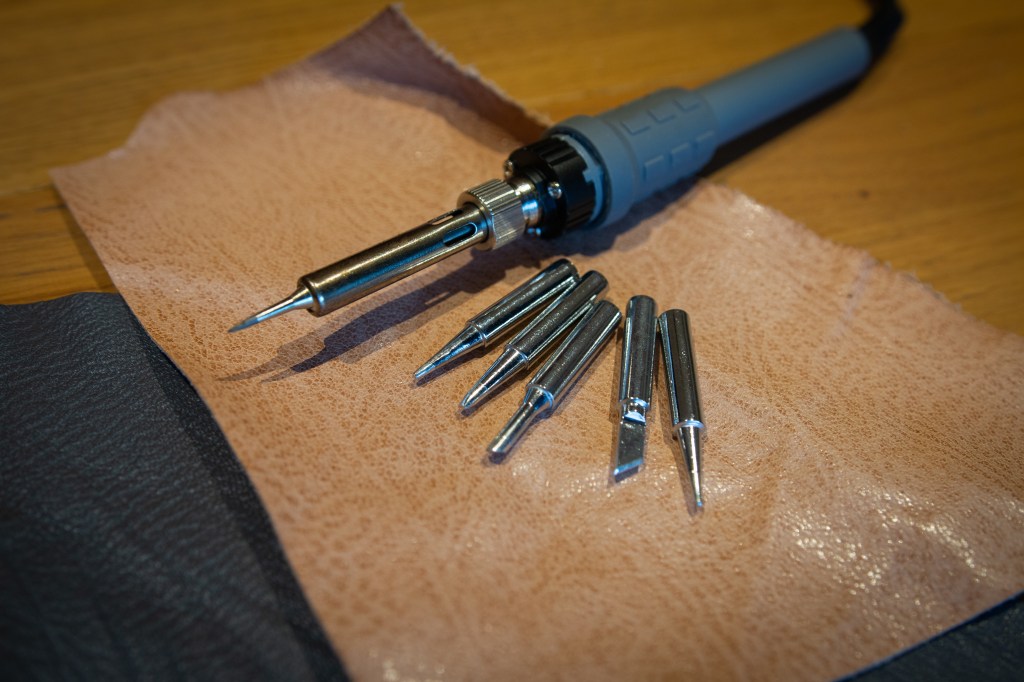 Having seen previously how the heat from a soldering iron could be used to apply various foils to leather, I wanted to try this myself to see if I could expand my drawing work onto this material. I therefore decided that a soldering iron should be the next addition to my toolkit. Researching the different types of irons, I saw that you can buy not only digital soldering stations, but also various tips for the iron, which are designed for different applications of solder. From my perspective, they looked perfect for adapting into diverse types of ‘pen’ nibs that could create different kinds of marks in different thicknesses.