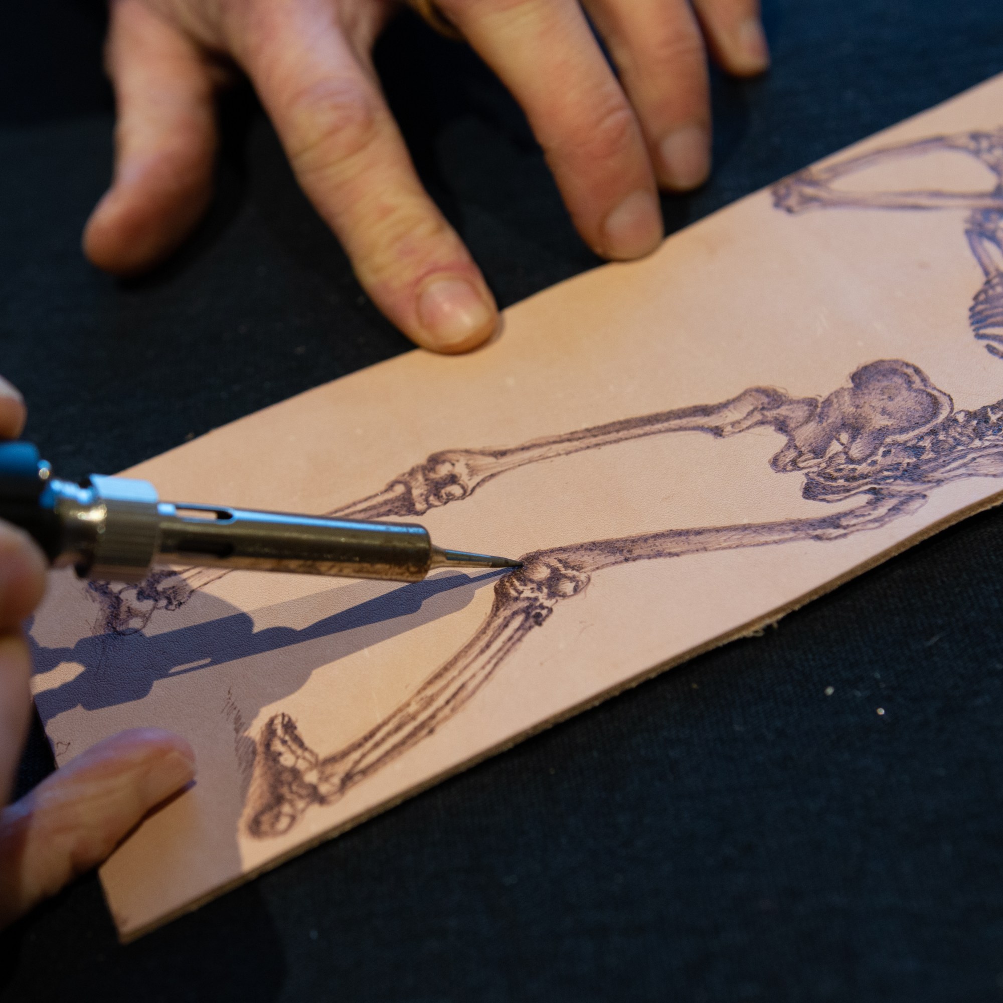 Recalling my research on blind tooling leather, I wondered what sort of blind tooling effect the hot soldering iron could create. I began to use my new iron as a pen to draw lines directly onto the leather. At first, this seemed to leave no impression other than a barely visible indentation caused by the pressure. I increased the heat to see if this made any difference. This time I was able to use the iron like a pen, creating dark lines on the leather by scorching the surface.