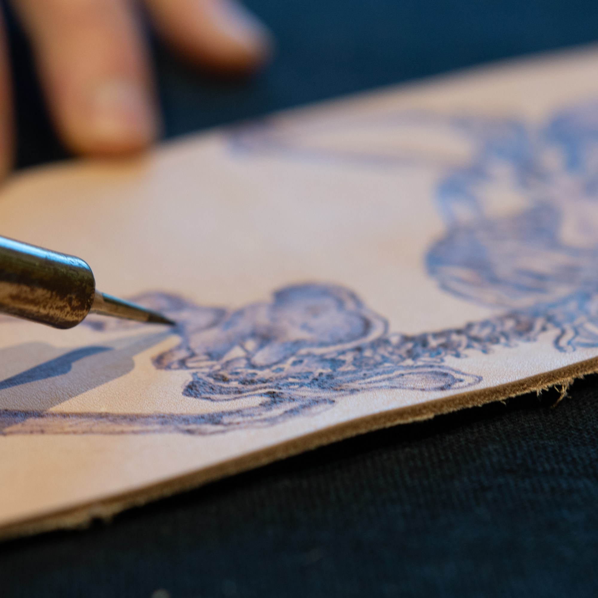 The idea for this tool adaptation emerged as I was experimenting with some leather offcuts. Having trained originally as a paper conservator and just started a job at the British Library, I felt inspired to learn more about the various elements of book conservation and history. At the time I was investigating tooling and ways of decorating leather; learning how various tooling foils could be applied to leather with heat. I was particularly interested in how blind tooling can be used to impress patterns onto leather without the use of foil, and this made me wonder about the different possibilities these processes and materials might hold. Coming from a background in fine art, in particular drawing, my first thought was, can I draw with this?
