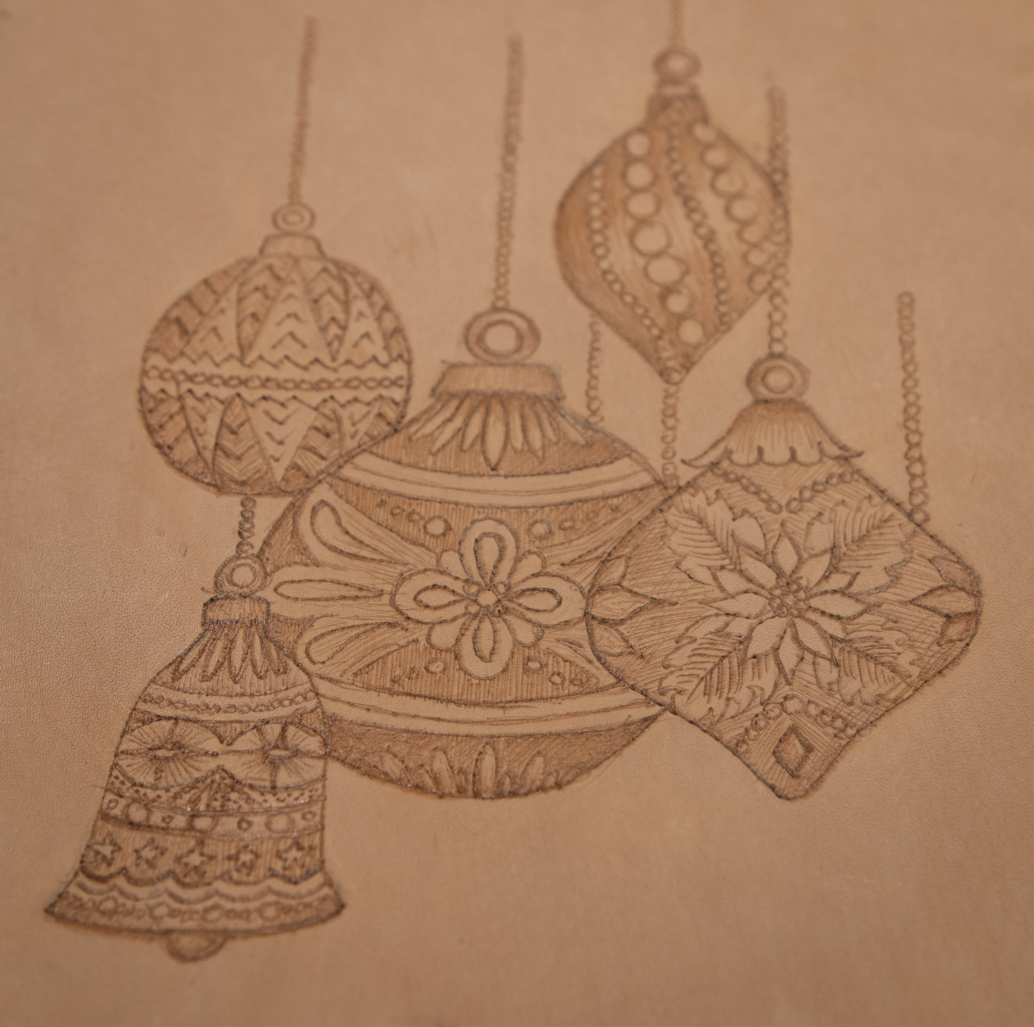 Recalling my research on blind tooling leather, I wondered what sort of blind tooling effect the hot soldering iron could create. I began to use my new iron as a pen to draw lines directly onto the leather. At first, this seemed to leave no impression other than a barely visible indentation caused by the pressure. I increased the heat to see if this made any difference. This time I was able to use the iron like a pen, creating dark lines on the leather by scorching the surface.