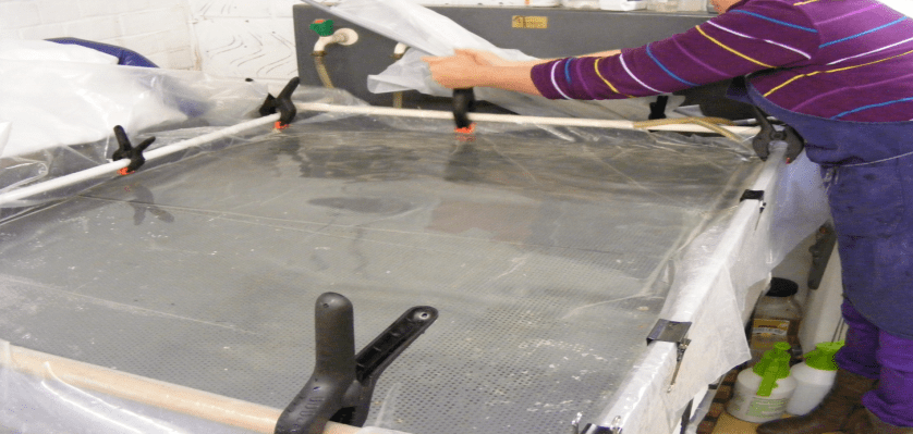The frame could safely support three drying rack shelves, which I made by sewing woven industrial screening fabric onto a frame made from PVC electrical conduit pipes and corners (Fig. 11.1 & 11.2). The PVC parts were sourced from a high-street DIY store. The fabric, made from PVA-coated glass yarn, was sold by Picreator Enterprises LTD (www.picreator.co.uk) as a support for drip-drying material after washing.
