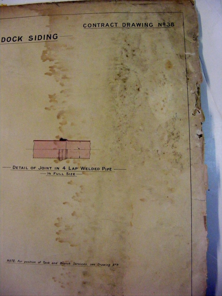 After the plans were rescued, they were kept under a bed for 30 years. While this ensured their survival, the storage space was not ideal. The book was not stored in an acid-free enclosure, and it had been exposed to fluctuating environmental conditions such as temperature changes from central heating and high humidity from people sleeping in the bed.