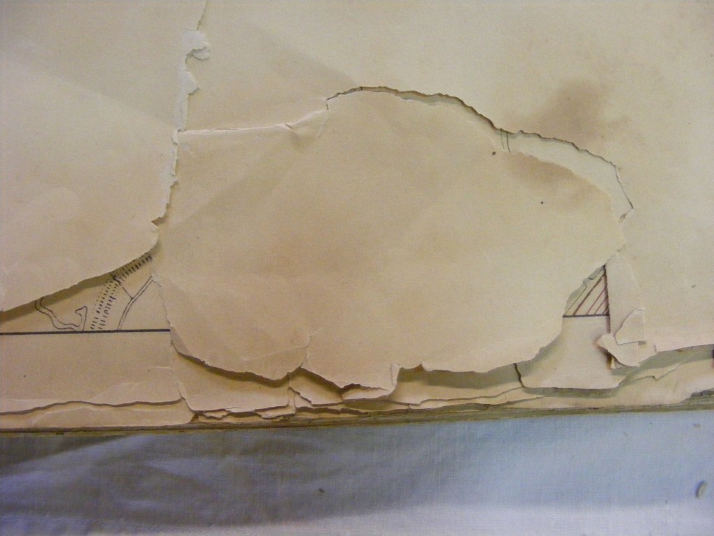 Pre-prepared spray deacidification would have been the easiest method of application on such a large item. However, this method does not remove staining, which was a limiting factor. I contacted several manufacturers to try to find out how much liquid would be required to spray the entire surface of the paper. However, they were not able to give me an answer, as this is subject to the characteristics of the individual paper. I could not easily estimate the cost of this option, but it looked likely to be very expensive, and would not have removed the stains, so I ruled it out.