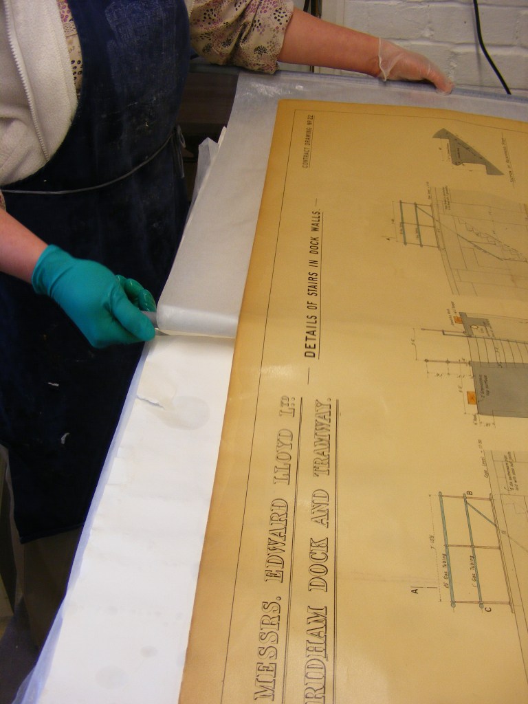 I realised that the plastic pipes would be problematic during the drying process. They were in the way of the pressing boards, so they needed to be removed. I did this by slowly rolling the Bondina® onto the pipe, and continuing to roll under the item, until the paper was off the Bondina®. Because the plans were made from very heavy paper, this posed no risk.