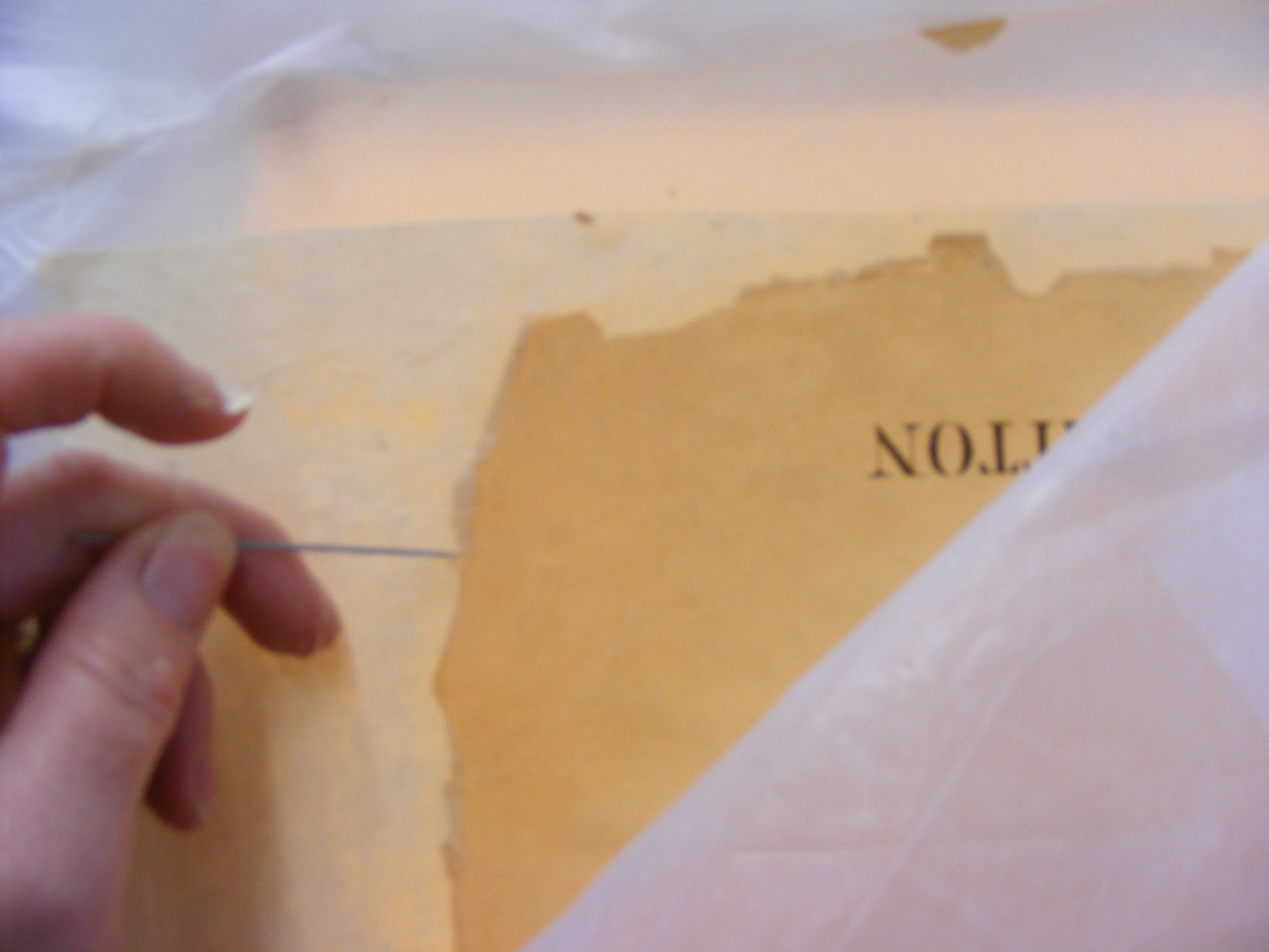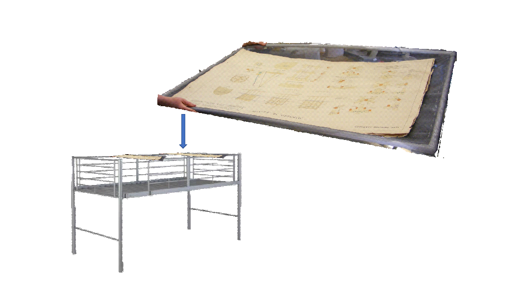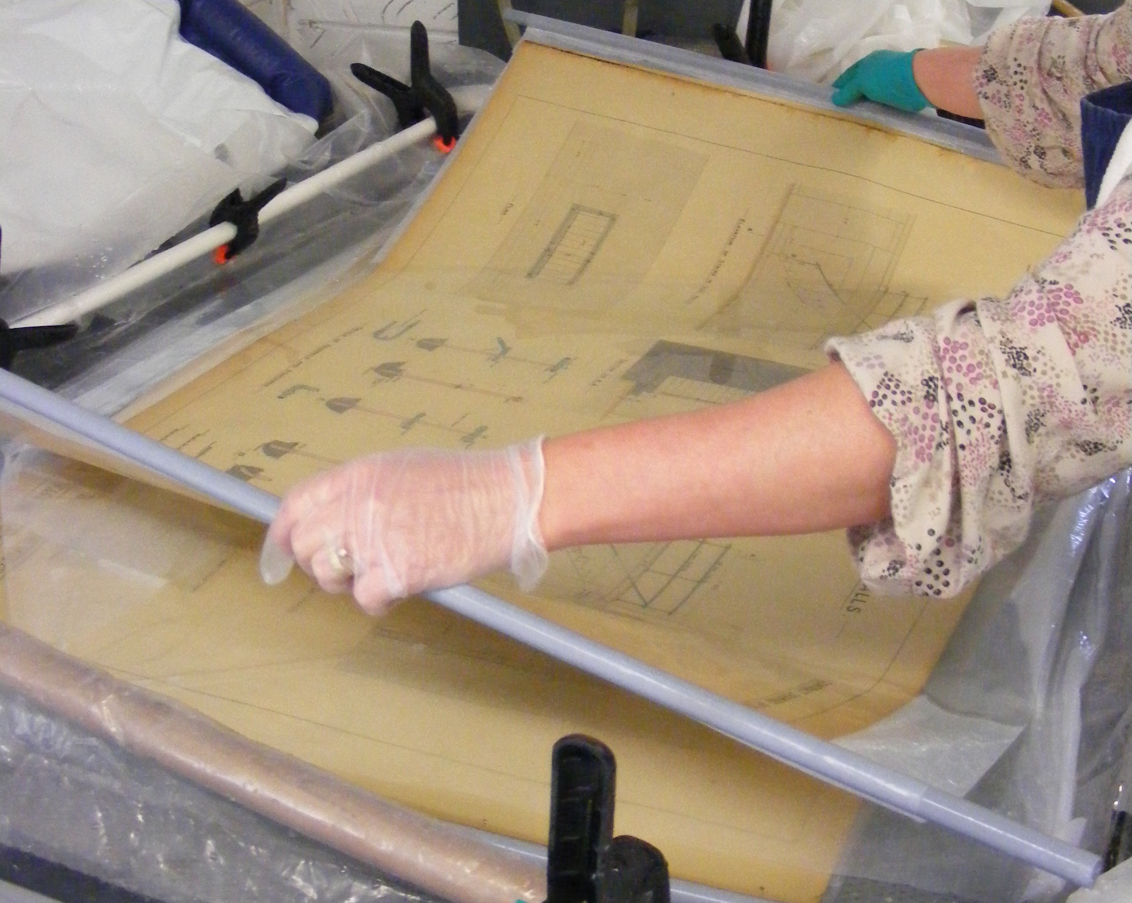 I realised that the plastic pipes would be problematic during the drying process. They were in the way of the pressing boards, so they needed to be removed. I did this by slowly rolling the Bondina® onto the pipe, and continuing to roll under the item, until the paper was off the Bondina®. Because the plans were made from very heavy paper, this posed no risk.
