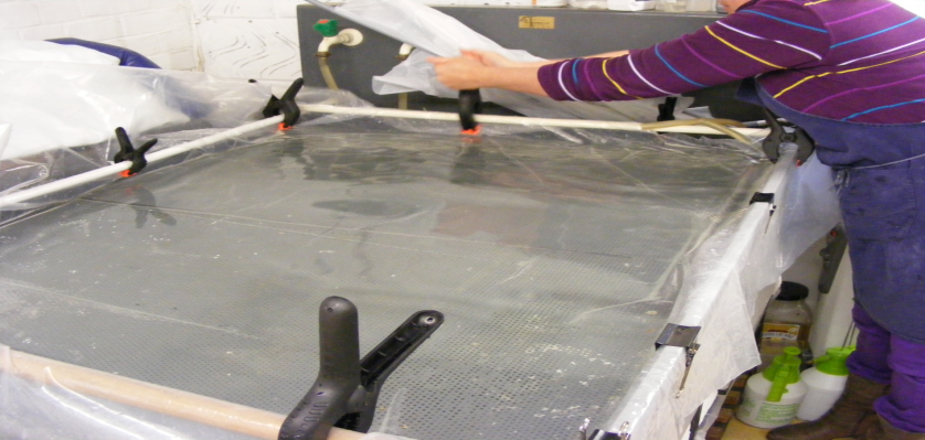 My sink was divided through the middle into two basins, each of which was too small to accommodate the large pages. I overcame this problem by using the two washing support platforms that came with the sink. I set them up to sit above the divider (Fig. 6.1). The ‘new’, raised sink area was lined with a polythene sheet, which was clipped onto PVC pipes to make a large shallow tray (Fig. 6.2). One side of the lining sheet could easily be unclipped to empty out the water. Not only would the pages now fit, but the height of the raised sink was also more ergonomically suitable for moving large objects.