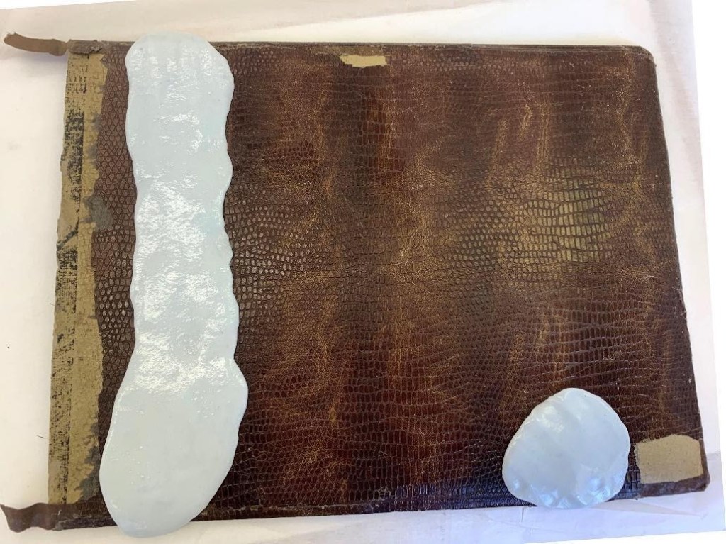 I tested plaster and the Steramould silicone material on a scrap piece of leather and compared their ability to pick up texture (Figure 2). I pressed the materials into the leather and left them to set. Steramould was left to set for approximately 15 minutes before being carefully peeled away. Both materials gave a good impression of the surface. Then I tested both materials on the album cover itself, pressing them into robust areas of the imitation leather. Both materials gave a firm and reusable cast. However, the plaster picked up colour from the album cover and left behind a white residue, and therefore was found unsuitable for use. Steramould did not pick up colour, and left behind only a small amount of oily residue, which did not penetrate into the covering material (Ridley, 2017) and was easily removed with damp cotton wool.