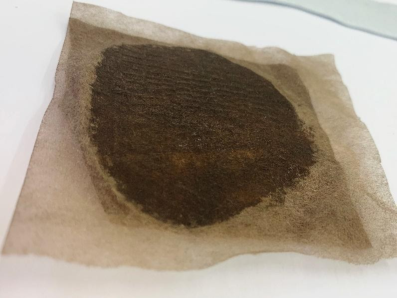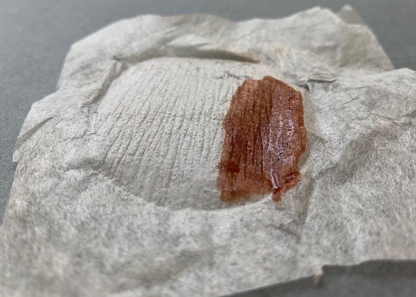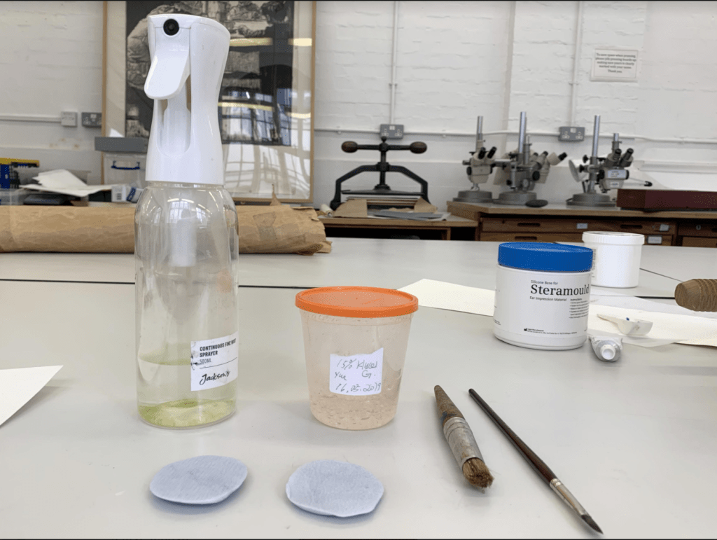 Charlotte Ridley had coated Japanese paper in a 15% solution of Klucel G in ethanol and pressed it into the cast in layers. When dry, the paper could be peeled off the cast, resulting in a laminated textured paper that was flexible. The advantage of using a solvent-based gel adhesive rather than a water-based one is that the tissue fibres do not swell, which means that they should not pull apart or tear when rubbed over the mould.