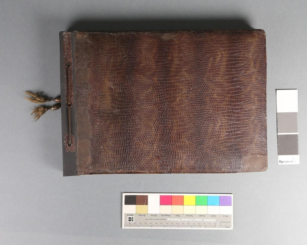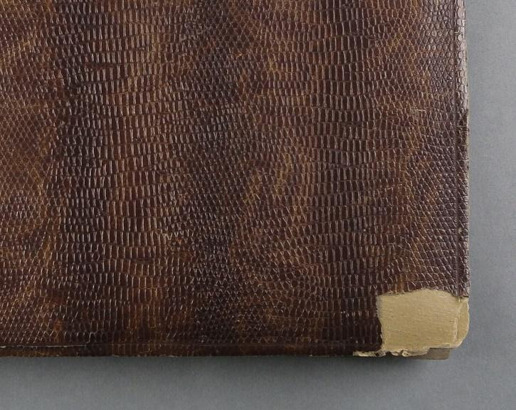 The album originally had a post binding style, bound with string through three holes. The boards were covered with printed (imitation) leather. They were worn from frequent use, and a piece of the covering material had been lost from the bottom right corner of the front board. The edges of the boards were split. Depressions were visible on the front and back boards.