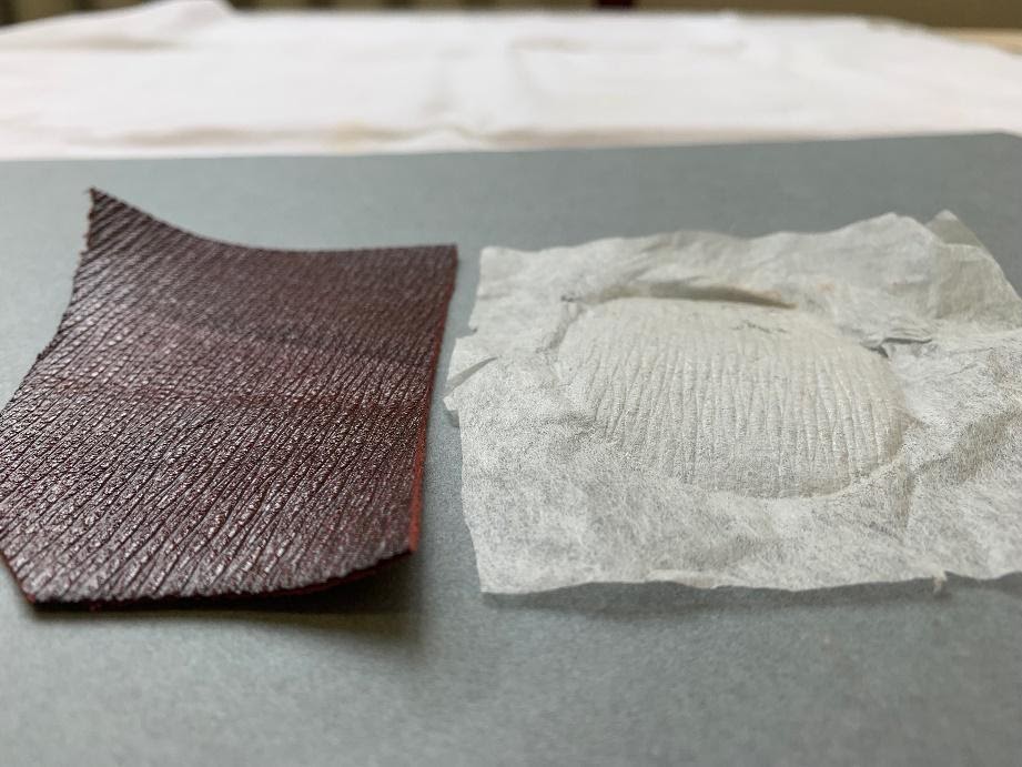 I wanted to test how different degrees of unevenness in the leather affected the results. I tested scrap red leather with a strong grain and scrap black leather with a more shallow grain, pressing Steramould onto both and then using it to mould Japanese tissue. I found that the silicone worked better on the coarse texture (Figure 6) than on the smoother one (Figure 7). The imitation leather of the album was sufficiently deeply textured, but this technique may not work well for some smoother or more heavily worn leathers.
