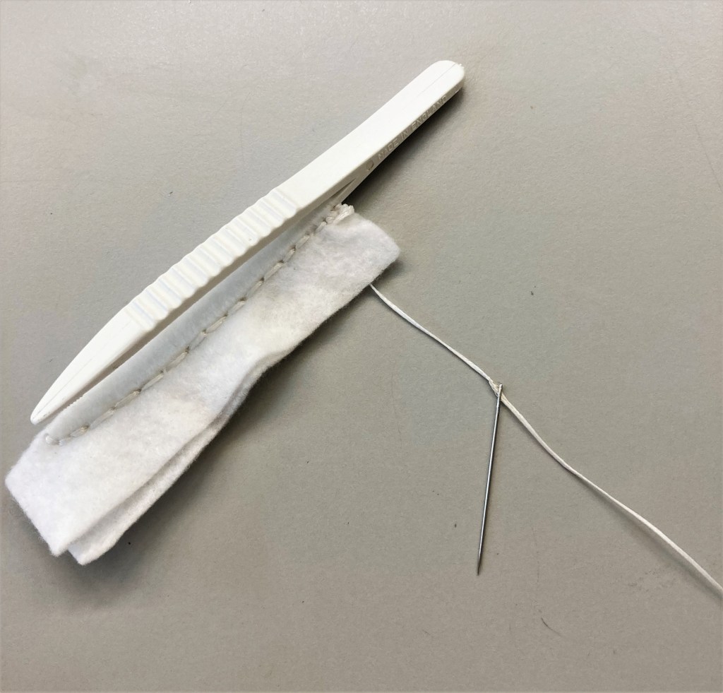 The tool created is a modified pair of horizontally fluted plastic tweezers. They can grasp the negative without any fingers coming near the easily damaged film. Each arm of the tweezers is encased in PEL Soft WrapTM 80 gsm, an acid-free 100% polyester flexible but strong and soft material, sewn tightly to the arm with 1 mm waxed braided polyester thread. The unsightly knot at the end is covered and secured with finer teal thread. Sewing was chosen over adhesive because it allowed the material to be wrapped snugly around the tweezer arms and because the stitching looked more aesthetically pleasing. An adhesive may have pulled away from the fibres and come loose after multiple uses; sewing is more secure. It should also deter any restless readers’ hands from picking at the edges. But most importantly, the wrapped tweezers keep the negatives safe both from scratches and from the oil and dirt from unclean fingers.