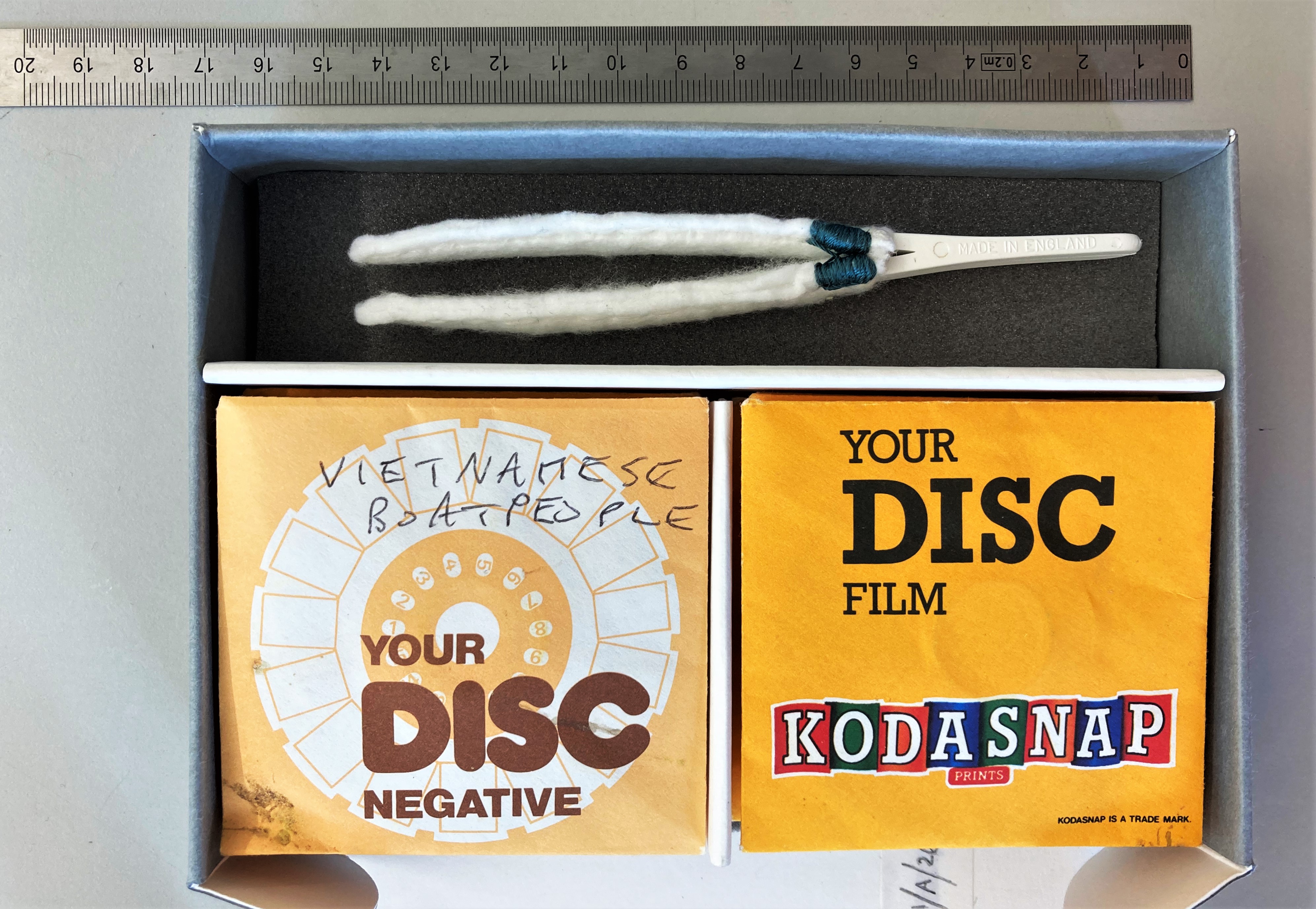This tool was an innovative solution to an issue that arose whilst rehousing a small selection from the extensive Audrey Amiss collection at Wellcome Collection. The collection varies widely and includes paintings, sketchbooks, drawings, letters and scrapbooks by the artist Audrey Amiss. She also made photographs using Kodak disc negatives – a format of film released in 1982 as a low-cost photographic medium. The challenge was to ensure that these discs could be handled by readers and could be temporarily removed from their paper sleeves without damaging the delicate film.