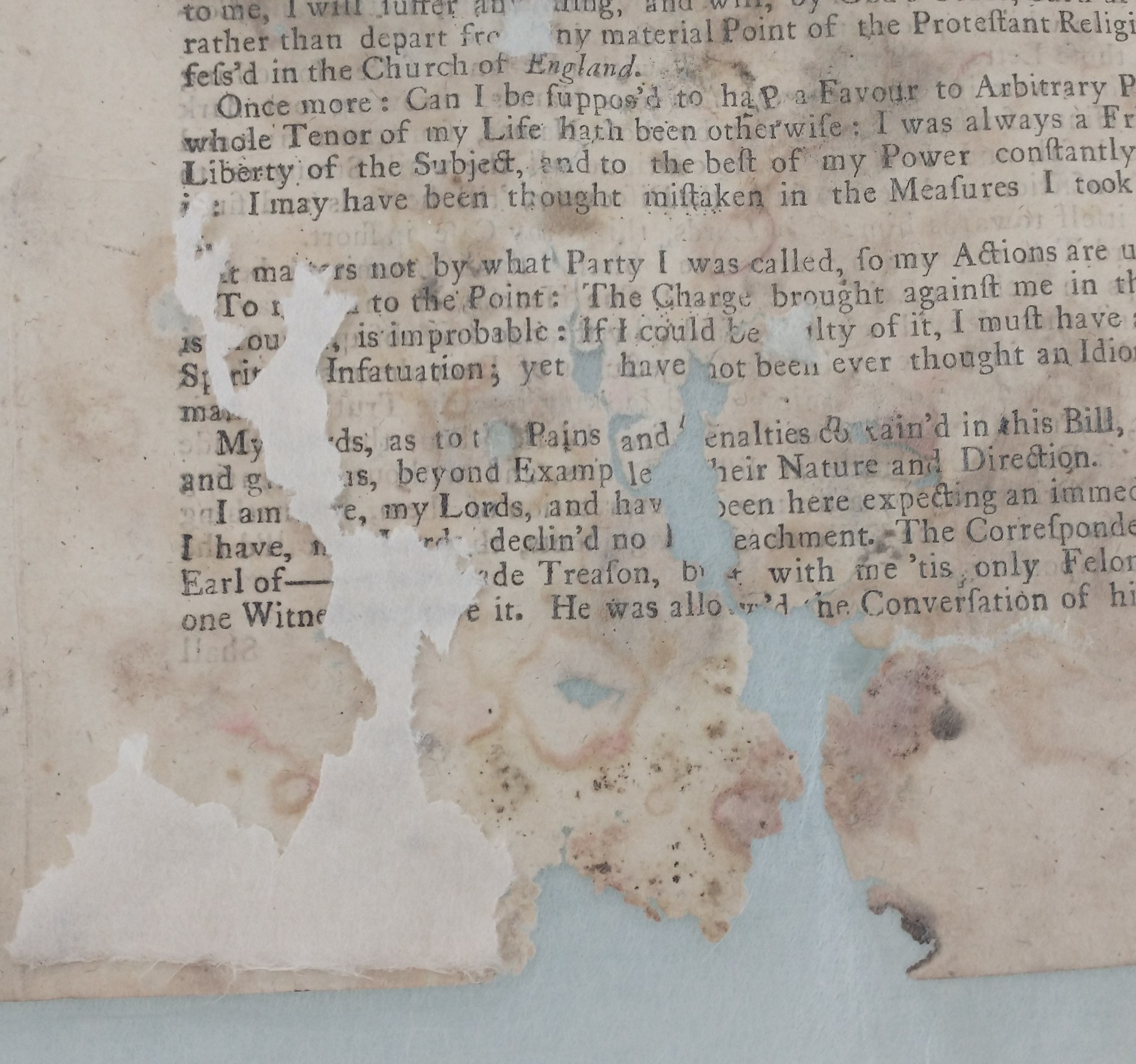 To use this tool, I place the paper to be infilled on a light sheet; then I place Melinex over the loss and hold the repair tissue in place. With the aid of light from behind, a lovely fill with neatly feathered edges is created. Depending on the tissue used, these may need to be trimmed back a bit. The result is quick and highly satisfying, as very complex shapes are easily created and slot beautifully into place.
