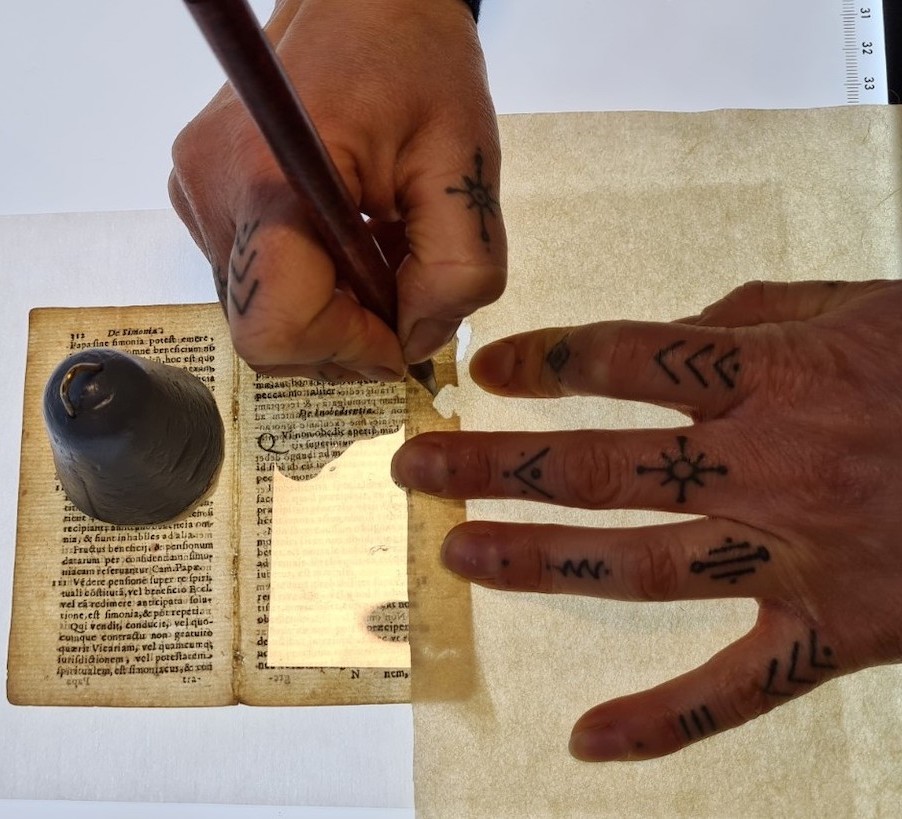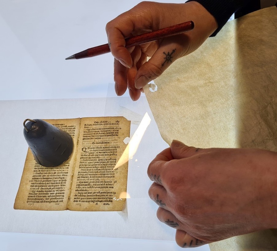 Despite being predominantly a book conservator, I spend most of my time cleaning and repairing paper. As this tool is like a pen, it is easy to hold, moves fluidly around curves and creates intricate shapes with ease. Along with a lightbox or light sheet, this tool makes near-perfect infills. I use it to shape thin tissues for backing losses and supporting tears, and for shaping infills made from heavier tissues. Therefore, it works for nearly all weights of Japanese tissue. If needed, it can also be used like a needle to pick out a small curve or corner.
