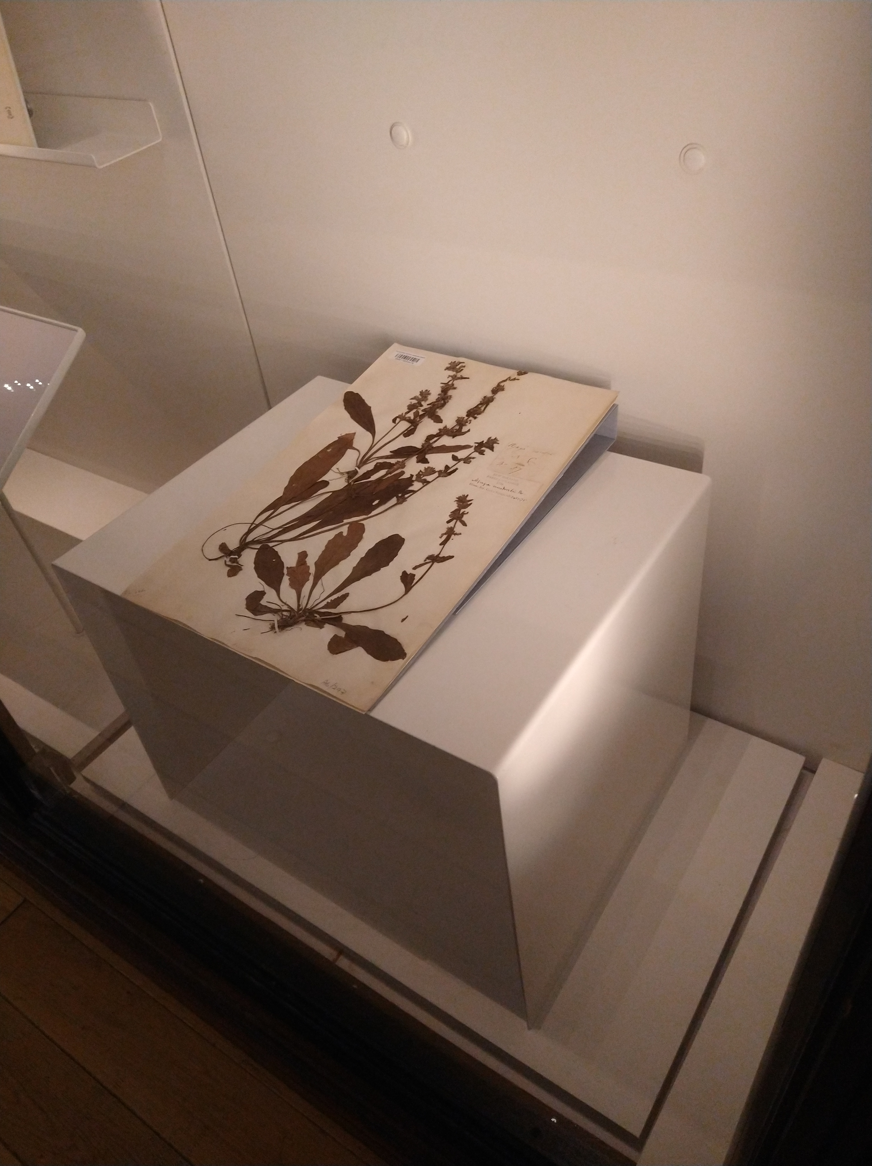 For the display preparation, you will need two small glass tiles, that spatula with one end covered with Velcro, a piece of felt (or Bondina® and blotter), a small weight, a cotton board aperture off-cut (from a window mount lid) 5 mm bigger than the herbarium sheet, adhesive of your choice and… your herbarium sheet.