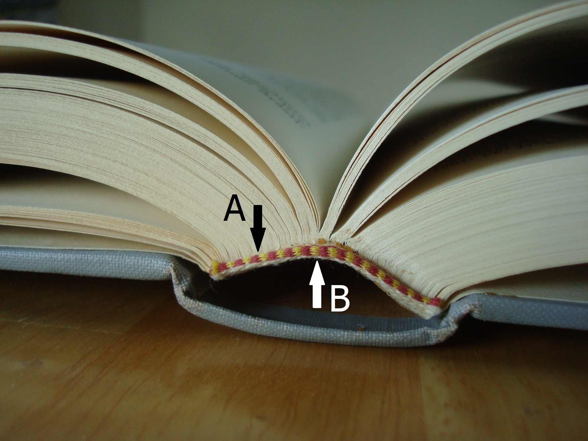 Figs. 2, 3 – Tension (A) and compression (B) layers: the tension and compression principle applies to any open book, regardless of the binding type. Photography by Paula Steere.