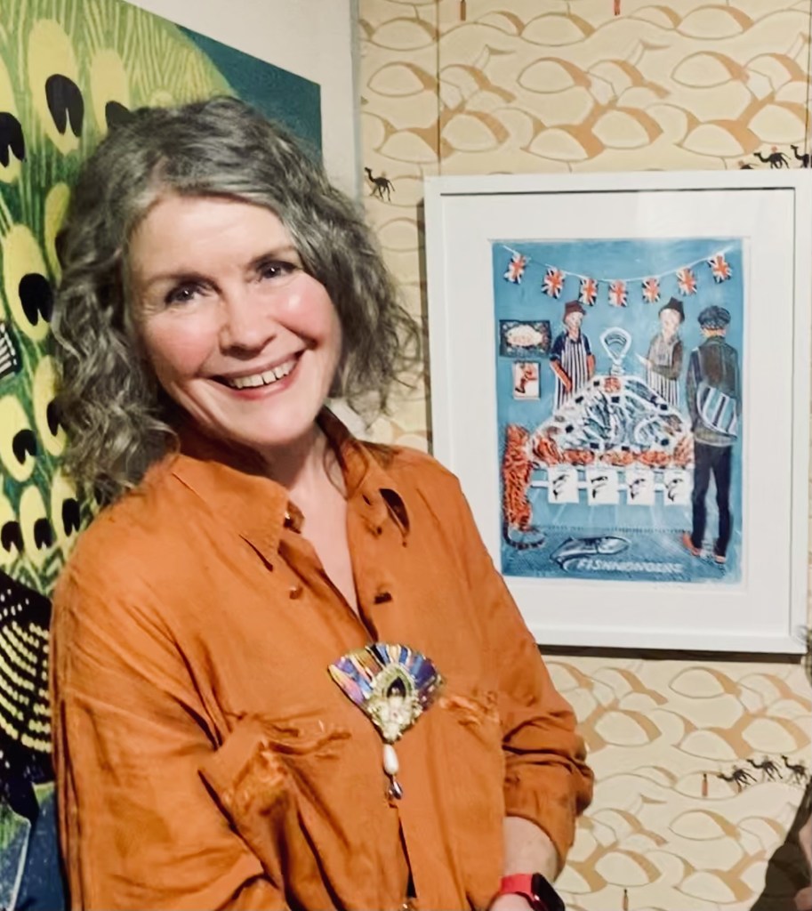Kitchen table printmaking. I was recently invited to create a new lino print in response to any piece from the Bawden archive. It is now displayed next to Fishmonger (Cawte & Skinner) by Edward Bawden at The Higgins Bedford. The exhibition opened in February 2024 and is attracting record visitor numbers – it is open until October, so do visit if you can!