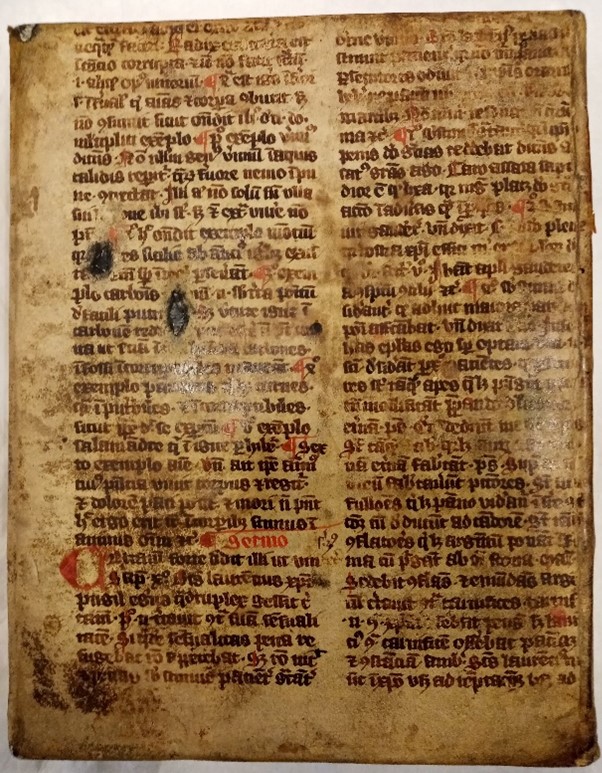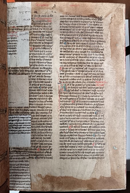 The parchment is covered in Latin text which, fortunately, has a clear running title at the top of the page: ‘De [co]gnitione anime sep[ar]ate’. This is likely a manuscript commentary on Aristotle’s De Anima [On the Soul] by Thomas Aquinas, possibly from the thirteenth or fourteenth century. There is also parchment from another manuscript in a different, likely earlier hand, with corrections and marginalia, acting as supports. Wellcome’s copy of Lexicon graecolatinum was bought from Steven’s auction house in 1923, and, unsurprisingly, there is little recorded information about the waste material except that it is from an ‘early’ manuscript.