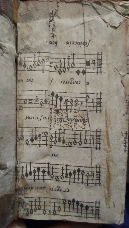 Fig. 1, 2 – Examples of waste material in Basilica chymica ([1623]) EPB/B/1677/1 and A map of the microcosme (1642) EPB/A/15685. The first example is a leaf from a mediaeval Latin manuscript, possibly thirteenth-century, being used as a cover. The second is a page of early-seventeenth-century printed musical notation for a hymn based on the Book of Romans. There are multiple pages of this musical notation being used as flyleaves at the front and back of the text. Photography by Alexandra Hill; courtesy of Wellcome Collection.