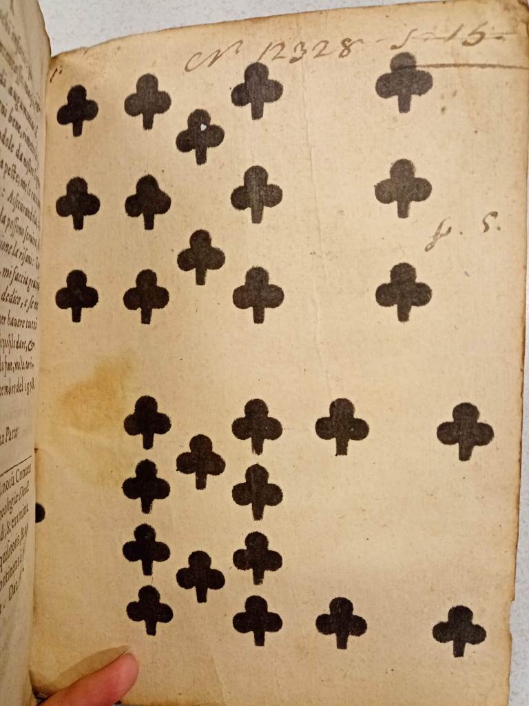 Waste material can show us what kind of material was lying around in early modern bookbinding workshops, and it was more than just mediaeval manuscripts. Wellcome’s copy of Trattato di peste (Asti: V. Giangrandi, 1598) is intriguing because the waste material in it is an uncut page of printed playing cards. Playing cards are highly ephemeral items that rarely survive, so it is exciting to find an example in such an unusual place. On this sheet, different numbered cards have been printed side by side. The book was printed in Asti, in northern Italy, and the design of the card suit suggests that it was also likely bound in the same area. That part of Italy, Piedmont, used the French-style clubs suit, similar to what we recognise as clubs today, whereas further south, the equivalent card suit would have had a baton or cudgel design.
