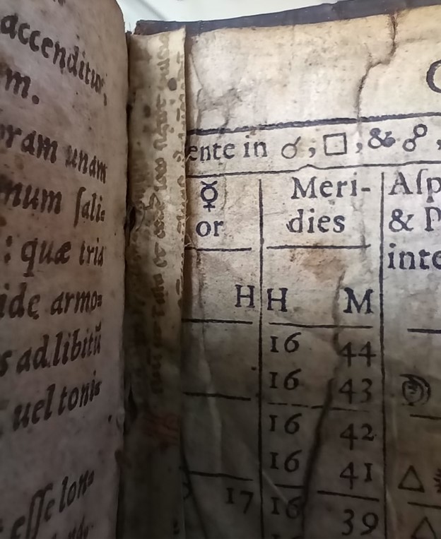 Some examples even show a mix of materials from multiple sources in the same book. One of Wellcome’s copies of De secretis mulierum libellus ([Lyons?]: [publisher not identified], [1566]) has both printed and manuscript waste material hidden within the binding. Because the fragments are small and lack a caption title, it is difficult to identify the source text. One fragment of printed Latin text appears to be from a religious commentary. The fragment has two sections of text, with the biblical text in larger gothic type and the commentary in smaller type to the side. Part of the biblical text refers to the son of Moses, while the commentary refers to conversion and persecution. The other fragment of printed text is from an ephemeris, a book which predicted the movement of the planets over the year. Ephemerides are another highly ephemeral item, as they covered a single calendar year and soon went out of date. The manuscript is more difficult to identify than the printed texts, as it is only visible in the gutter and most of it is covered with the printed pastedown.